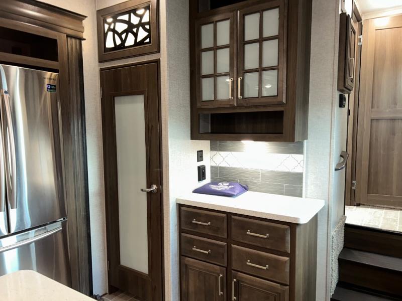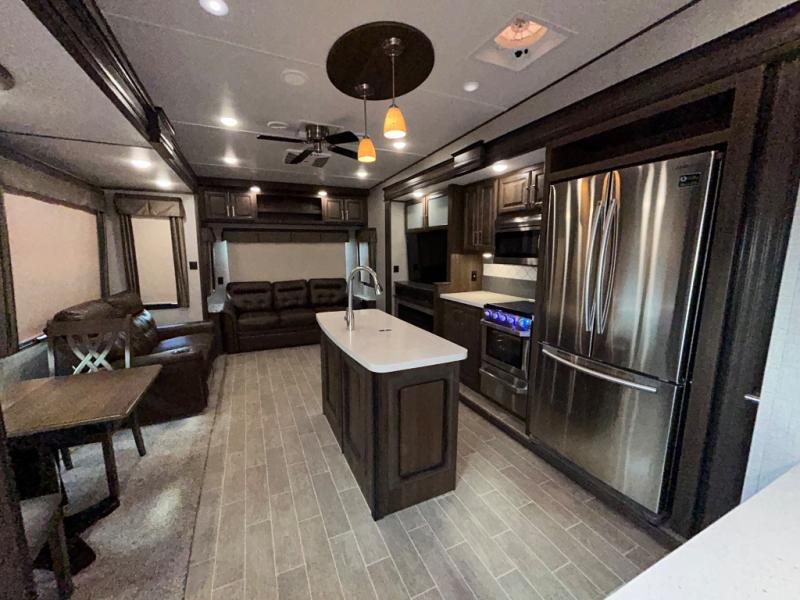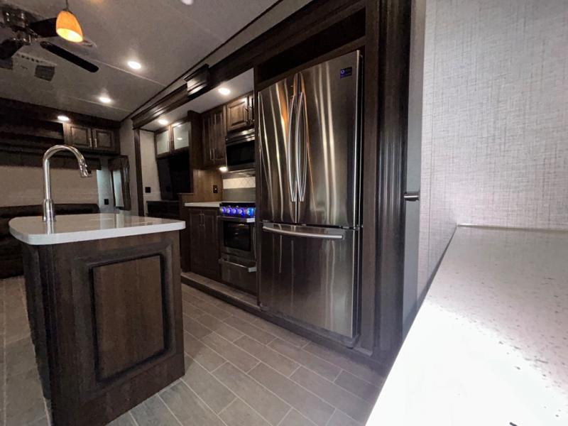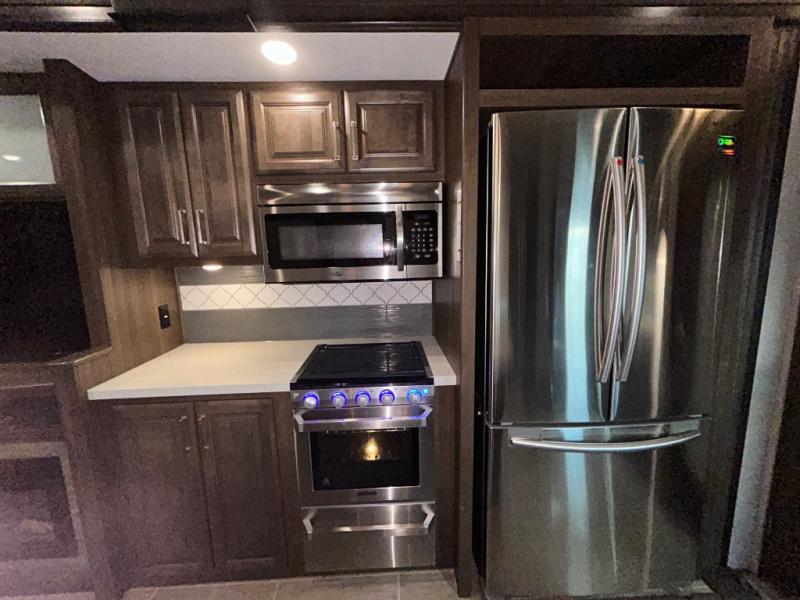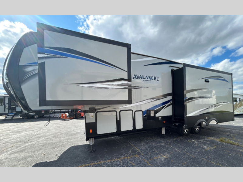 The perfect RV for entertaining and relaxing is this Keystone Avalanche fifth wheel. The combined living and kitchen area includes dual opposing slides for more floor space as you work around the kitchen island and more seating accommodations as you gather together each night on the sofa sleeper, the theater seating featuring heat and massage, or the free-standing table with chairs. This unit also offers a fully loaded kitchen with an 18 cubic foot refrigerator, a three-burner range top, a large pantry, and a curio cabinet.