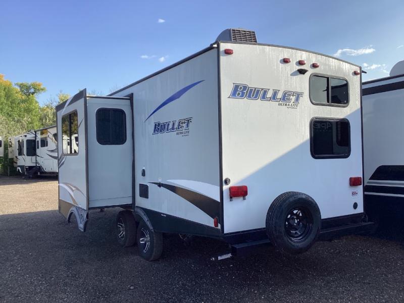 Load up your family and set out to your favorite campground with this single-slide Bullet travel trailer. You will enjoy the comfort and seclusion that the private bedroom brings, and your children will happily choose the double-size bunks for both play time and nap time. More sleeping space can be created by simply changing over the U-shaped dinette from a cozy dining area into a relaxing bed giving this trailer the ability to sleep eight people each night. Not only will you find enough tools indoors to create a perfectly home-cooked dinner while on the road, but you will also find room outside with the outdoor kitchen to whip up meals when you want to spend your evenings cooking in the fresh air.