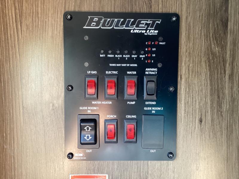 Whether you're spending your time soaking up the sun at the edge of the lake or trekking into the forest on a hunt for fresh berries, the Keystone Bullet travel trailer will not only get you to your destination, but it will also keep you happy while you're there. With the most luxury features of any other ultra lite trailer, like the exterior speakers, laundry chute, and LED lighting, the Bullet continues to provide the number one ultra lite travel trailer in America. Because of the contoured shape of the radius front profile on the Bullet, it offers less wind resistance as you tow it along the highway, and when you combine that with the extremely lightweight floor plan design, you get one unit that will help you cut costs when spending money on fuel.