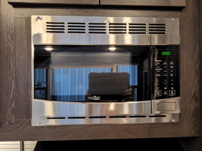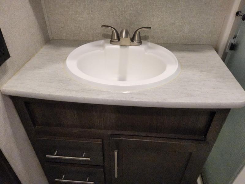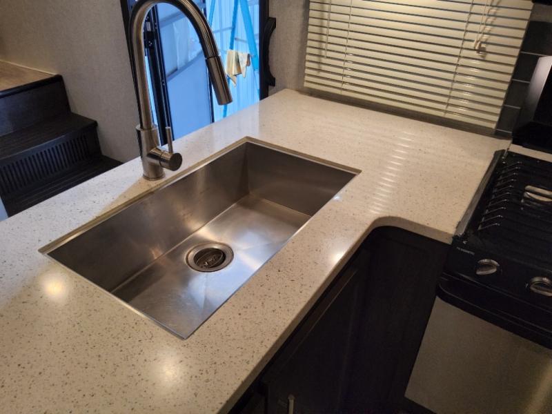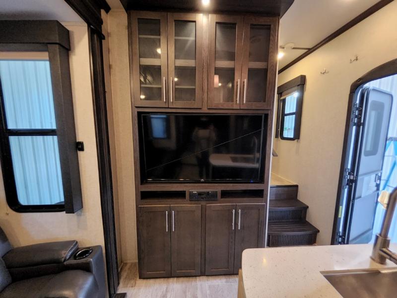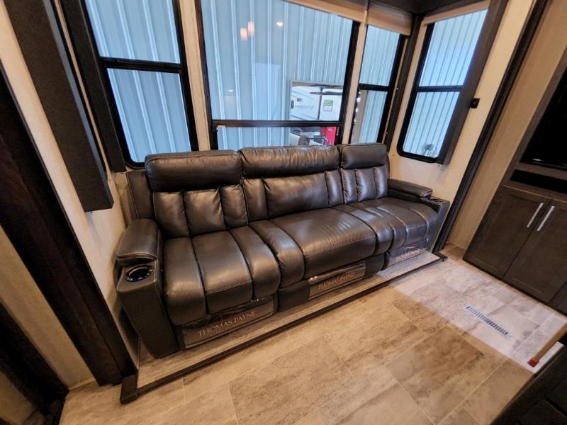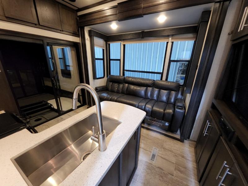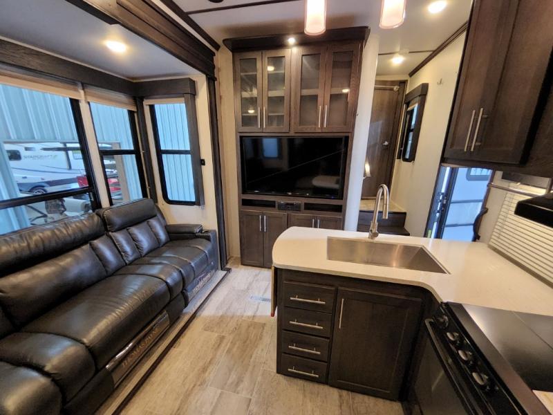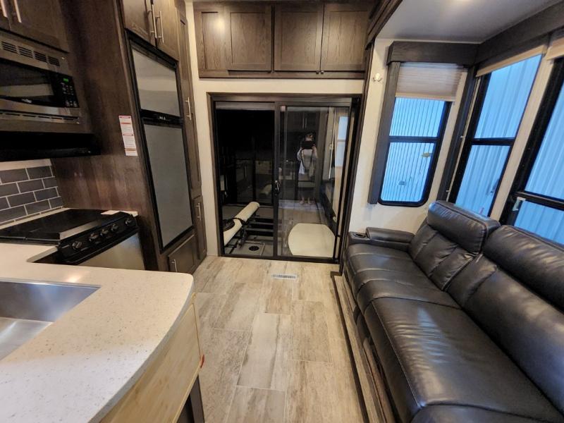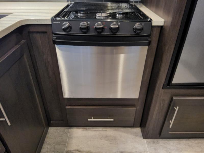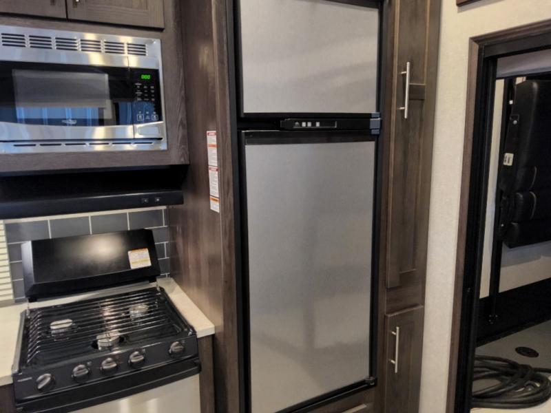 After everything is unloaded from the 10' garage area, put up the 16' electric awning and enjoy the great outdoors for a few hours before heading inside this fifth wheel. Here, you will find a private front bedroom for mom and dad, a living area with a 97" sofa with recliners, and a rear garage that once unloaded, can be a second bedroom for the kids. There is an electric bed with dual opposing sofas that can turn into a sleeping space or two. This room can also be used as a playroom while you are on vacation. The cook in the family will love prepping and cooking meals in this kitchen, while the kids enjoy a little entertainment on the 50" TV.