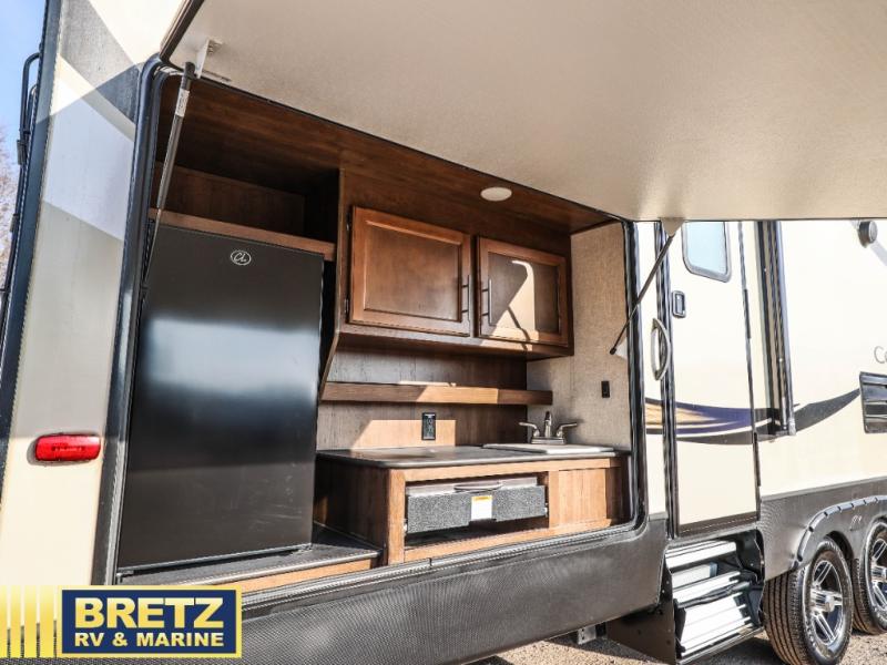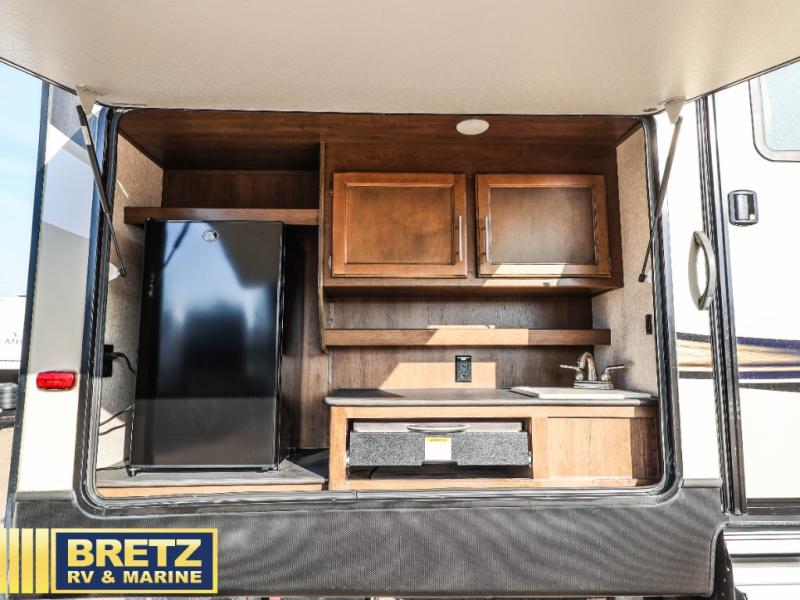 This master bedroom features a half bath, and the rear bunkhouse offers triple bunk beds providing separation from you and the kids at nighttime. The kiddos will enjoy relaxing on the jack-knife sofa or bunk beds when the weather isn't just right for playing around the campsite. The dual entry doors into the unit allow for easy in and out of the bathroom or main living area and front bedroom. Having the convenience of a full bathroom with a shower will allow everyone to stay clean. You have the choice of cooking inside with full amenities, or outside on the capital grill. You can also store extra drinks in the mini refrigerator, and wash the dishes in the outside sink. You will find other features that make this the perfect RV such as the Hitch Vision, the MaxTurn technology, and the options to choose from!