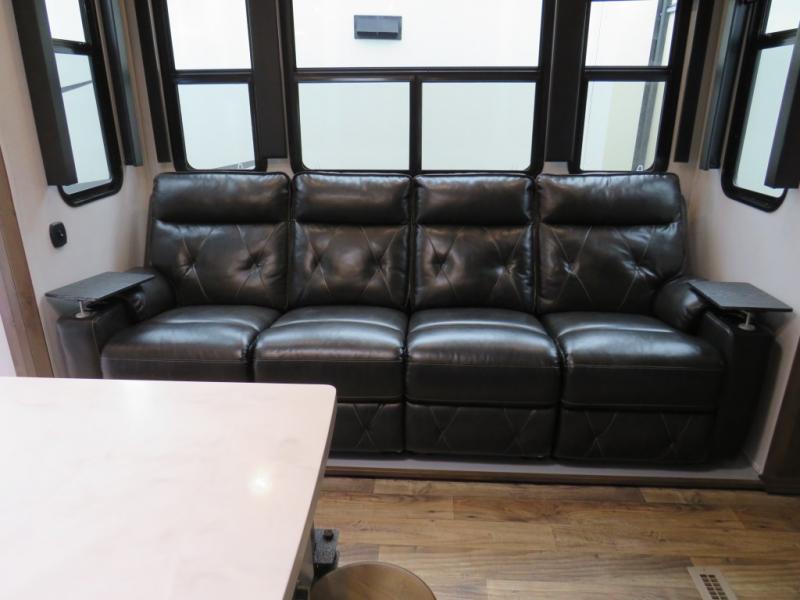 It's time to stop taking boring and dull vacations when you can have exciting and adventurous excursions with this Fuzion toy hauler! This exceptional unit gives you all the space you need to sleep nine people each night which makes it the perfect party vehicle for you and your family. And with the private master suite that has its own entrance into the full bathroom and the 11' separate garage that transforms into a bunkhouse suite with its own half bathroom, this unit will wow you at every turn. You will also love all of the many different residential features that have been included in this model, like the 18 cubic foot refrigerator, the residential shower with seat, and the residential sofa with heat and massage capabilities.