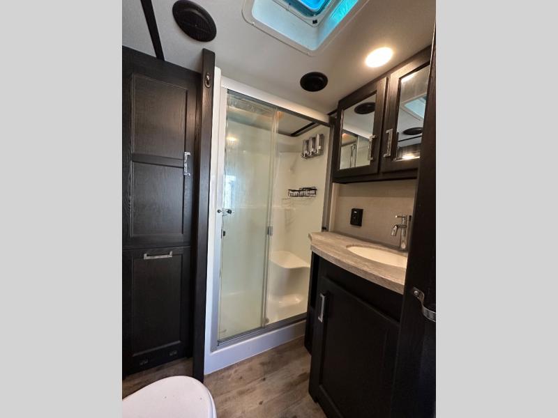 With an outdoor side patio, two power awnings with LED lights, and two entry doors, this Fuzion toy hauler is the perfect match for those who enjoy entertaining guests while traveling. The kitchen is also helpful for keeping your guests happy with the 18 cubic foot refrigerator that will store all of the ingredients needed for many hearty meals and the convection microwave that will heat up leftovers quickly for a midnight snack. With the residential shower in the main full bathroom, it will be easy to stay clean even after a muddy day in the woods, and the skylight will let in plenty of natural light to illuminate the interior and keep things looking bright and cheery.