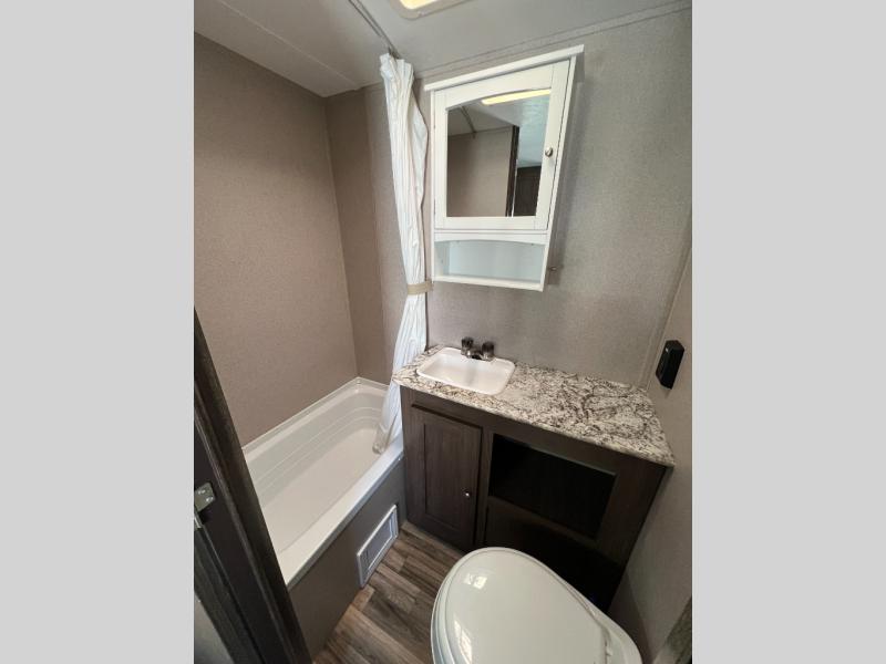 Inside you’ll find a functional kitchen with cooktop, refrigerator, and pantry storage, along with a private bathroom and plenty of cabinetry to keep everything organized. Outside, the power awning and pass-through storage make campsite setup easy, giving you the perfect basecamp whether you’re planning quick weekend escapes or longer road-trip adventures.