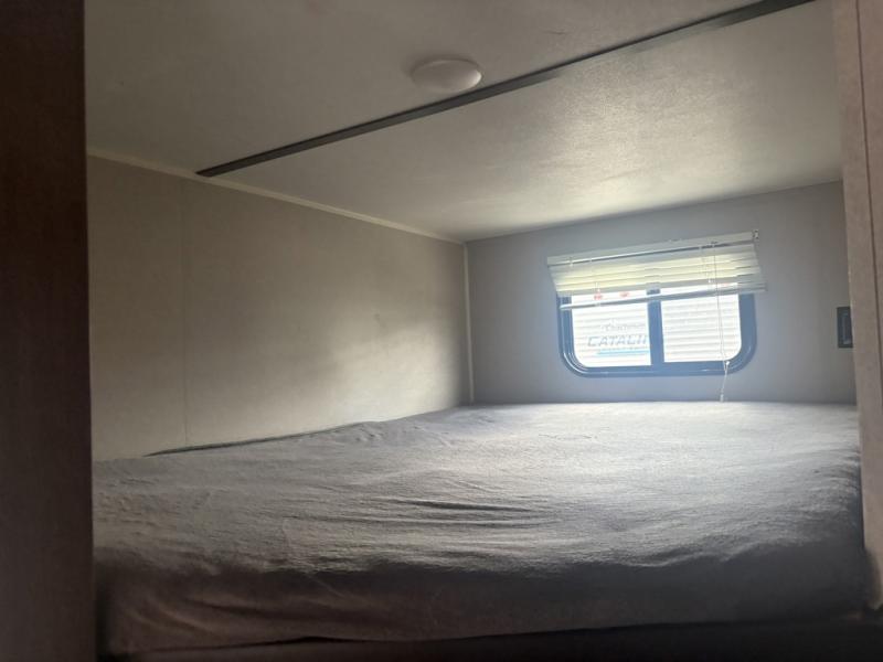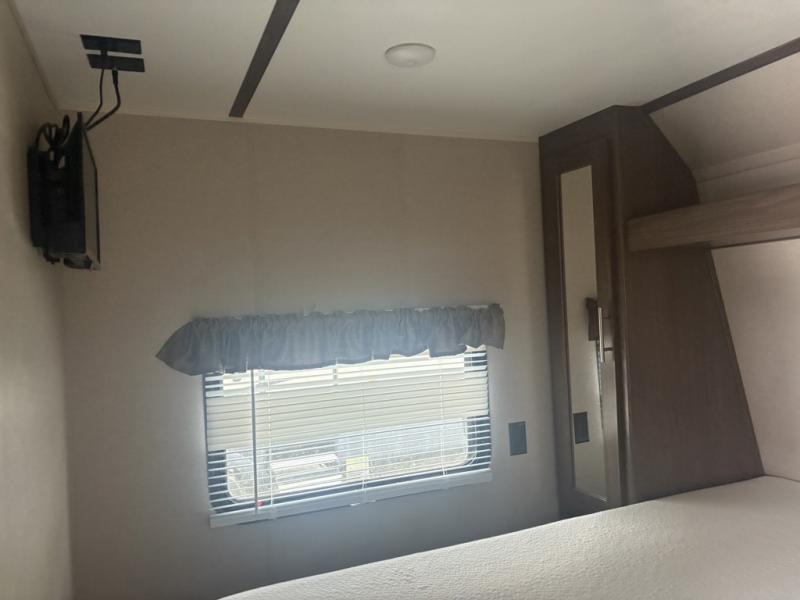 With sleeping for nine, this Keystone Hideout is the perfect camper for a larger family to enjoy. This model offers a rear bathroom where you can easily and privately get ready for the day. Sleeping space for everyone can be found with the set of double bunk beds, a queen-size bed in the private bedroom, a booth dinette, and a sofa. Throughout this model you will find shelf space, as well as overhead cabinets for all of your extra camping items, and the two bedroom closets will come in handy for holding onto those extra sweaters and hiking boots. In the evening if the weather is nice, you will want to sit out under the lighted adjustable power awning and enjoy the scenic sunset together!