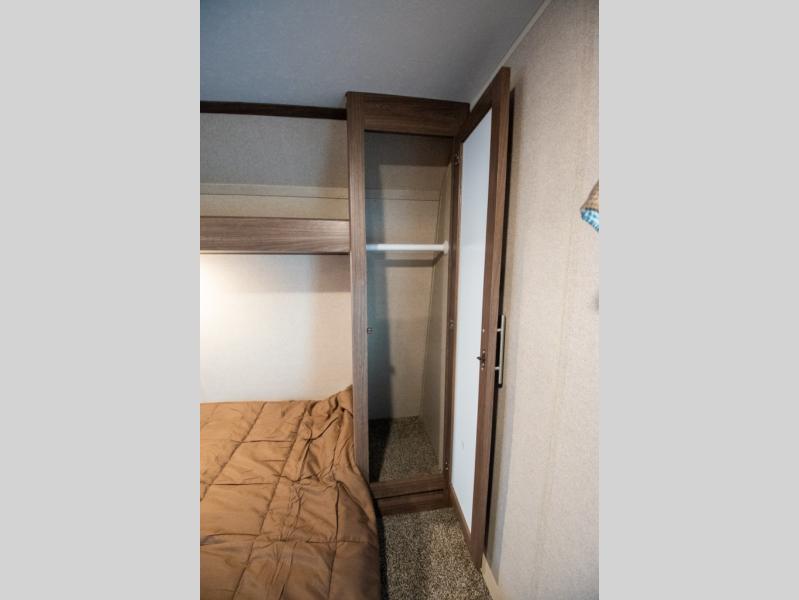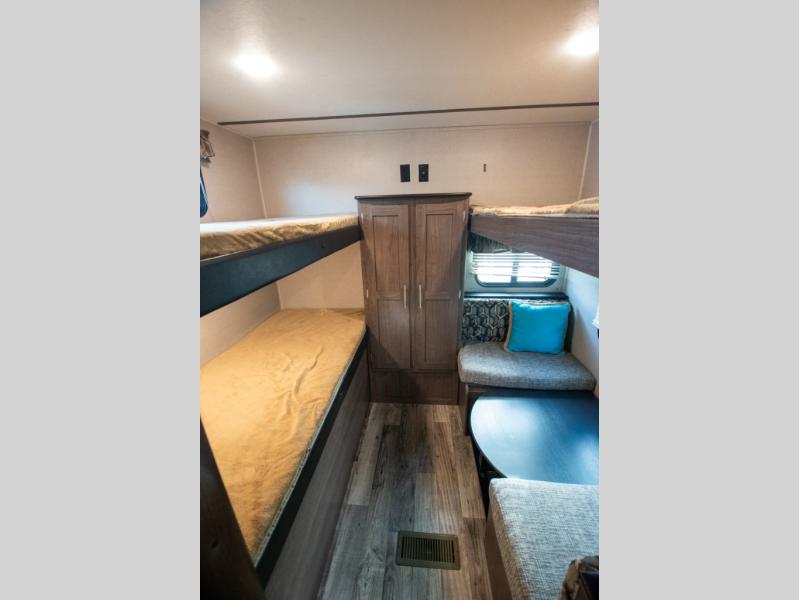 Take the whole gang camping in this Keystone Hideout travel trailer. With a private bunkhouse, U-shaped dinette, and private bedroom, this unit has the ability to sleep eight people wherever you go. Inside this model you will find a large pantry for your dry/canned goods, and if you choose to prepare your meals outside in the outdoor kitchen, then you can also watch your kids play at the campsite while you cook up dinner. The lighted adjustable power awning provides plenty of shade so that you can enjoy your meals outdoors even when the sun is shining brightly.