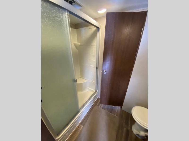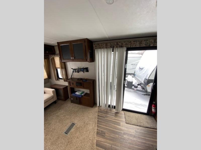 Come see just how fun and easy any camping trip can be with this double-slide Hideout travel trailer. Towards the front you will find a patio door as the main entrance into this unit, and located in the rear private bedroom is the second entrance door which will allow you to come and go as you please without waking up the rest of your guests. With its king bed slide and full-length wardrobe, the master bedroom is completely accommodating and comfortable, and because the walk-through bathroom has doors on either side, you can directly enter the bathroom from the bedroom.