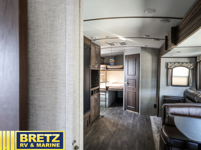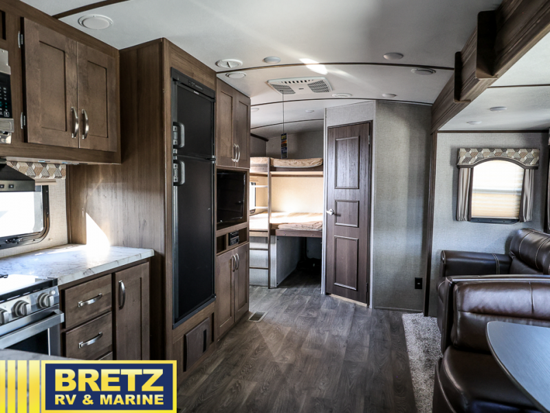 Just imagine you and your family at your favorite campground hiking the trails, biking around the campsites, and laughing around the campfire with this Laredo travel trailer to call home at the end of the day. You will appreciate having a pull-out camp kitchen outside to make meals when the weather is just too nice to be cooking indoors, and the 20' awning provides shade from the elements. When it's time for bed, you can get to the front private bedroom from the second exterior entry door while the kids head in the main entry by their double-size bunks and the rear bathroom. If you need extra sleeping space, fold down the booth dinette and tri-fold sofa sleeper.