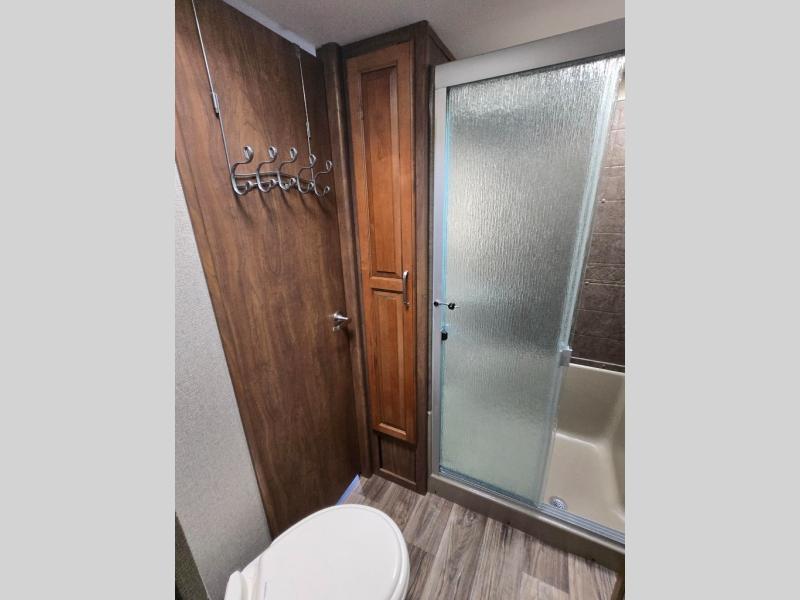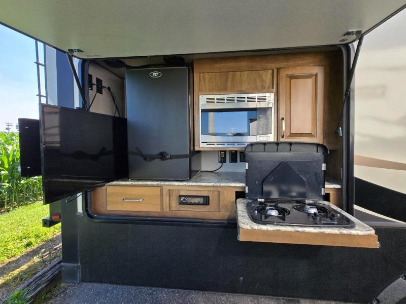 What I liked most: Glass cabinets vs wood, I think they look better. Controls are conveniently located on the wall right when you first walk in. The shower looks larger than similar views I've seen. The bedroom has plenty of storage with a wardrobe closet and that cabinet with 4 drawers in it. It has a long looking island with extra cabinetry. Pantry has a full size door which means it will have a lager storage capacity. Stadium seating couches make a better entertainment experience. Sturdy aluminum steps. The outdoor kitchen outside is great, it has a swivel pull out tv, a microwave, a stove, fridge, stereo and a cabinet and drawer for storage.