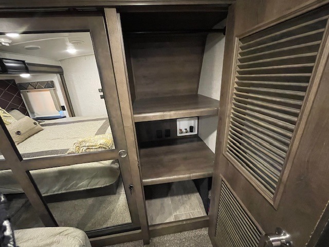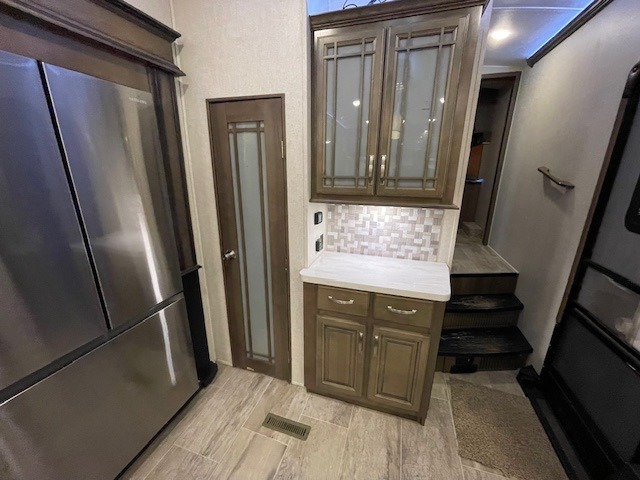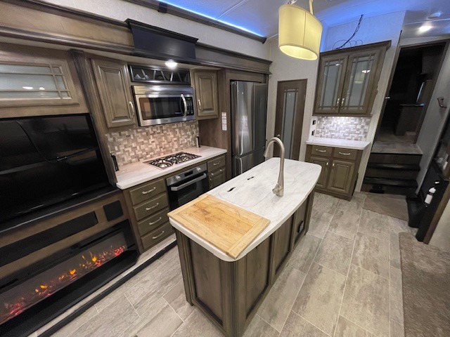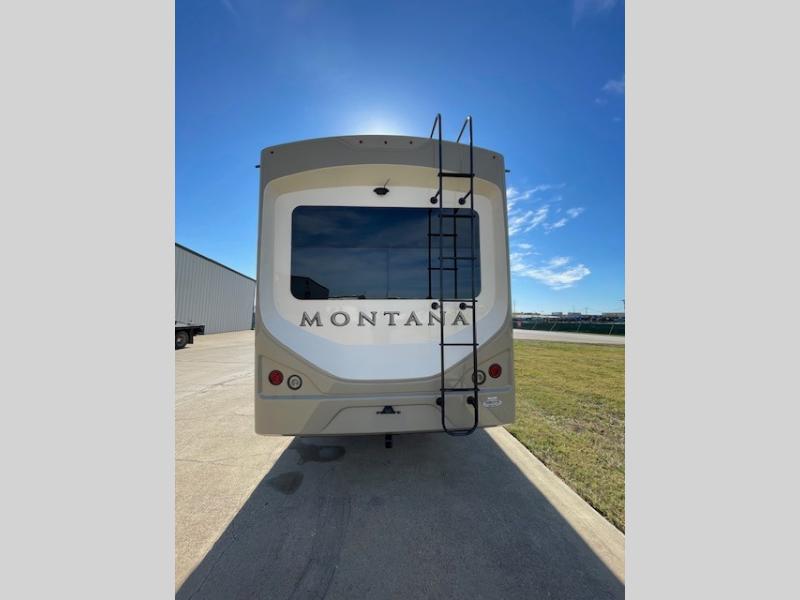 When you are ready to head out in comfort to see the countryside, take this Montana with you. This fifth wheel offers a rear living and kitchen area with dual slide outs for more interior floor space, plus seating for the whole gang including theater seats with power recliners. You are sure to enjoy the HDTV and fireplace on those inside camping days. The kitchen offers the chef a center island for preparing food, an 18 cu. ft. residential refrigerator, a convection microwave, a coffee station for the coffee lover in the family, and a pantry for your dry goods, plus more. You will also find plenty of storage throughout for all your things. Outside there are two awnings providing an outdoor living space, and you will find additional storage. Take a look, you will be pleased you did.