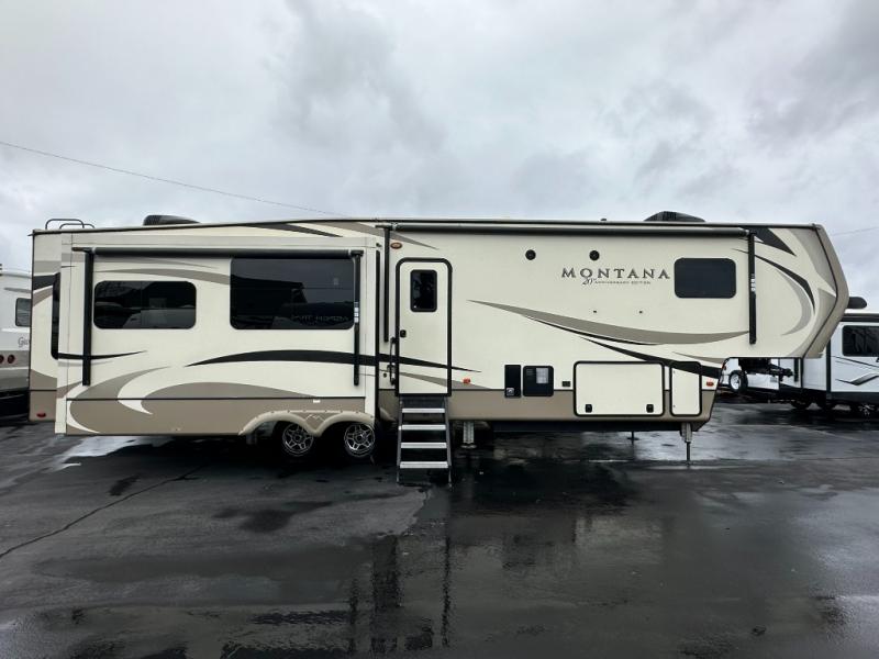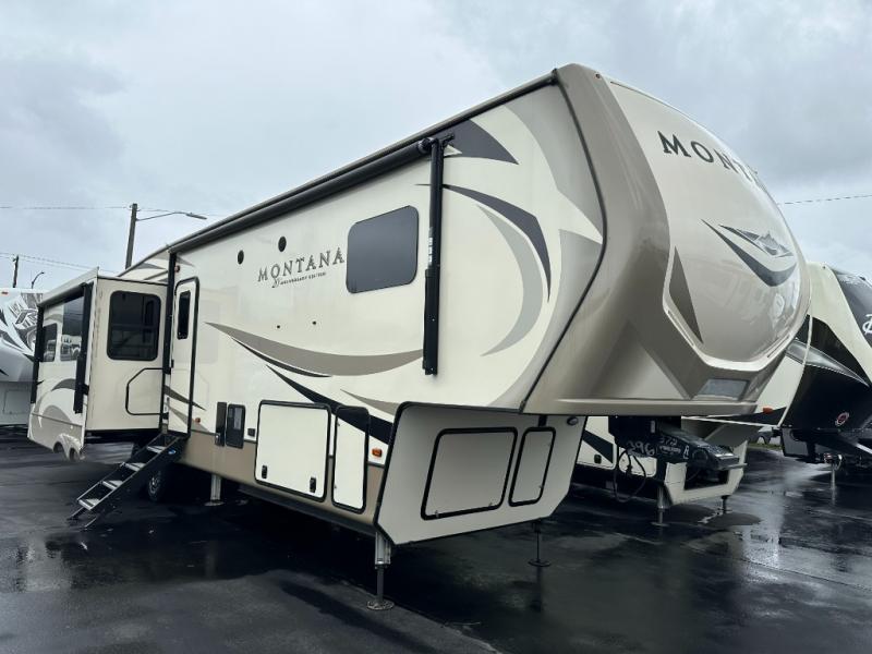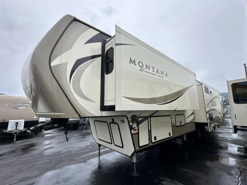 It's time to start planning your next campout with family and friends in this Montana fifth wheel. Just imagine a wide open living and kitchen area thanks to the dual opposing slide outs. You are sure to enjoy the theater seats with power recliners and additional furniture when watching the HDTV while keeping warm from the fireplace. The cook can prepare meals and the guests can wash the dishes on the kitchen island. There is an 18 cu. ft. RV refrigerator and pantry to keep all your food stowed away, plus a convection microwave and three burner range to make a warm meal. The master bedroom includes a slide out that stretches into the hallway giving you more space to add a washer and dryer if you like that option. You also have dual entry into the bath as an added convenience especially at night. You will find plenty of storage throughout for all your things including an entry wardrobe/closet. When you want to enjoy the outdoors, you can relax under one of the two awnings. You will also appreciate the 20th anniversary edition enhancements, take a look!