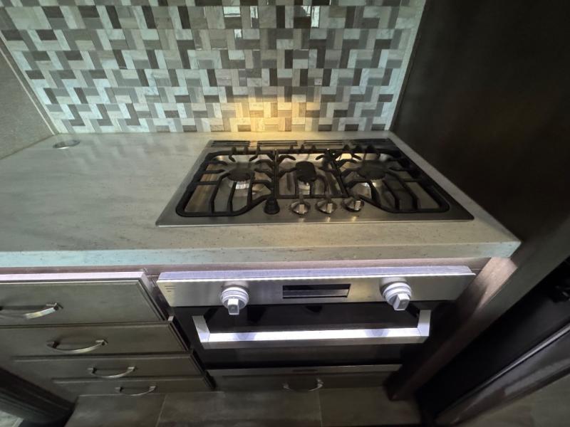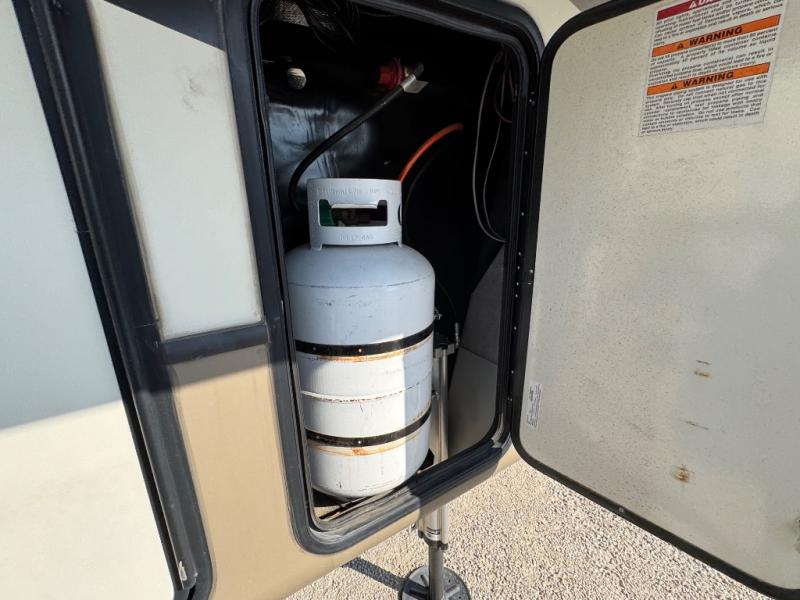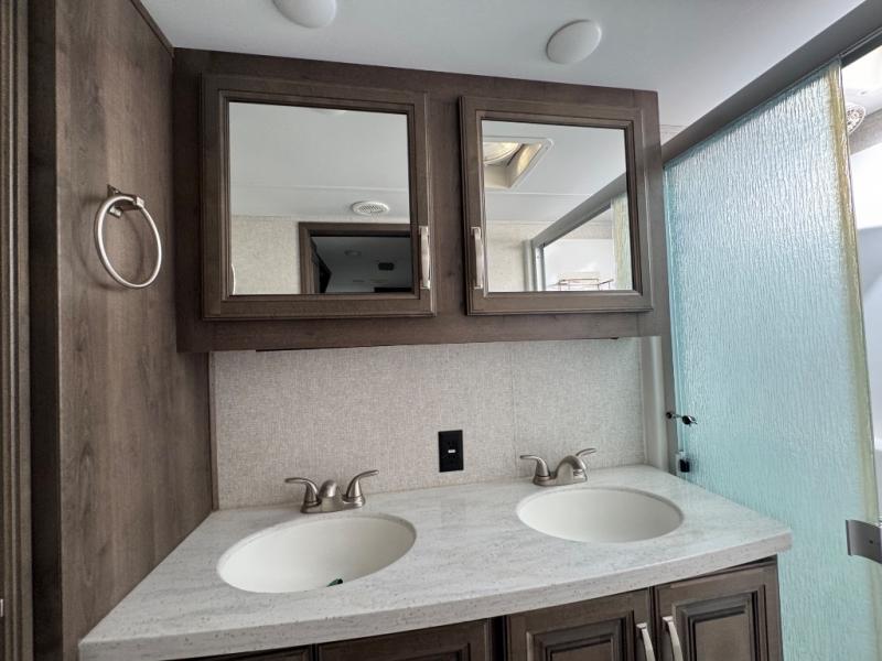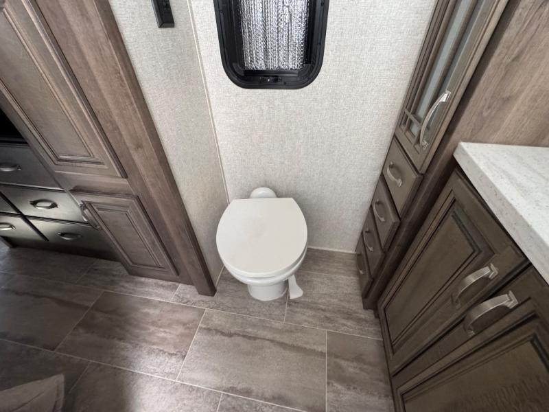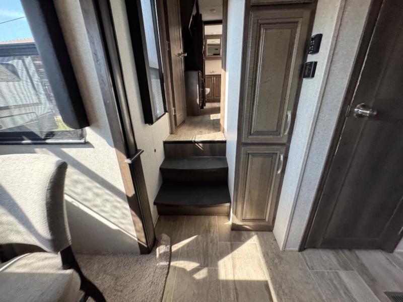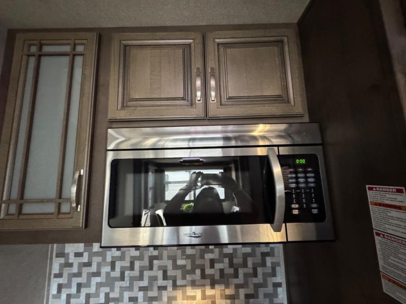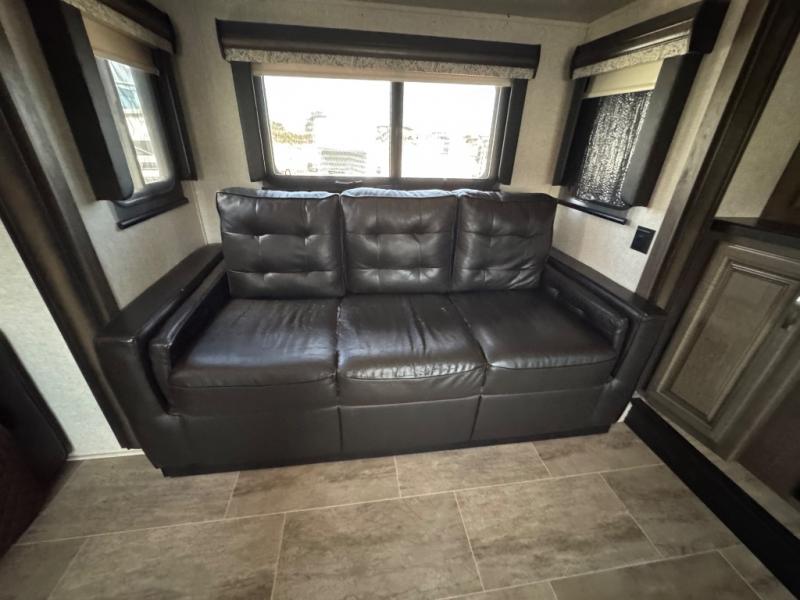 The full-timer or weekend warrior will enjoy the separate living area in the front of this fifth wheel when watching the big game on the HDTV, or enjoying the views out the patent-pending windshield. You can invite camping friends over thanks to the dual opposing hide-a-bed sofas and theater seating with power recliners. Your friends can even spend the night as the furniture offers extra sleeping space as well. The centrally located kitchen provides lots of space to make meals and snacks, plus storage for your cold items and dry goods in the residential refrigerator and pantry. You might even offer everyone a cup of Joe from the coffee station. The handy half bath is off the kitchen, plus you will find a center island and free standing dinette. Take a walk through the bedroom to find clothing and blanket storage, and a queen bed as you reach the rear full bathroom. You will also find barn doors that save you space. Take a look!