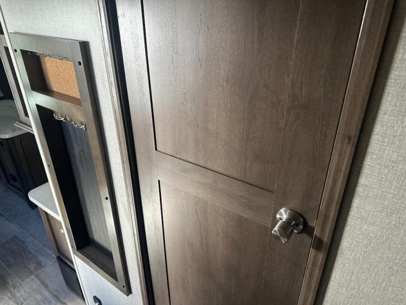 If you want your own space to cook, your own space to watch TV, and your own private bedroom, take a look at this Montana fifth wheel. This layout offers a rear living and entertaining room with plenty of seating including dual hide-a-bed sofas and theater seats with power recliners. Imagine everyone gathered around the HDTV and fireplace to talk about their day, watch a movie, or relax for a while in the warm indoors. The kitchen offers a separate space to make and eat meals. You will find a center island, an 18 cu. ft. residential refrigerator, a convection microwave, and a pantry, plus more. There is inside storage throughout for your clothes, camping gear, and kitchen cookware. And outside there is exterior compartments including a slide out storage tray.