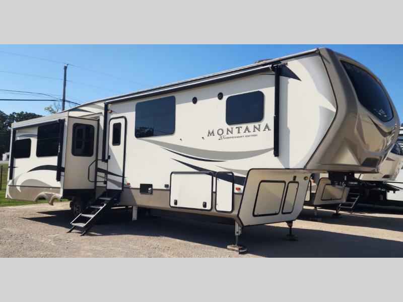When packing for your next trip in a Keystone Montana luxury fifth wheel you will appreciate the enormous drop frame pass-through storage compartment, the MORyde "Step Above" entry steps with strut assist, and the LED light package including "super-bright" taillights with backup marker and off-door scare light. The Montana 20th Anniversary Edition adds exclusive features such as the Key TV satellite prep, LED accent lighting, Tru-fit slide construction, and Easy Sweep resilient flooring. You will love the in-floor heating ducts, which allow for more airflow to be distributed evenly for optimal comfort. the LED motion sensor light in the pass-through compartment and convenience center, plus the Four Season Living package allowing you to travel whenever you like. It's time to find the luxury fifth wheel you can enjoy for years to come, choose a Montana by Keystone today!