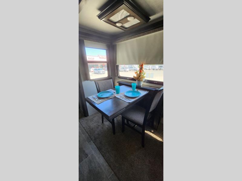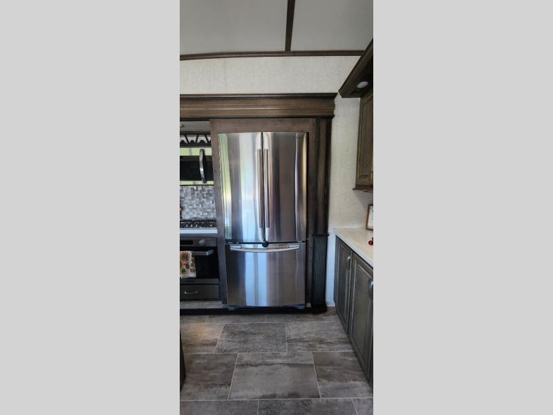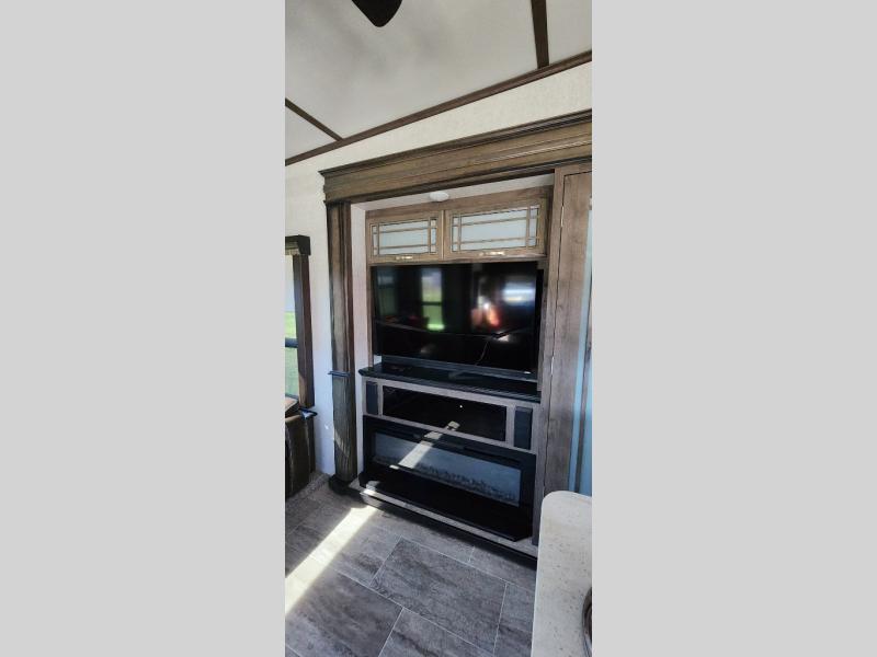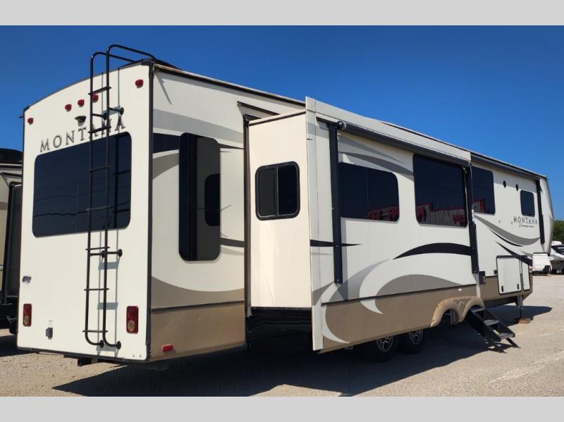 You are going to love the master suite in this fifth wheel! With triple slide outs, a unique window lounge up front, and all of the necessities plus some, this can truly be your luxury home-away-from-home! The master suite features a patent-pending windshield with a lounge and storage underneath, a walk-in closet between the bedroom and bathroom including a washer/dryer prepped space, and access to the bathroom. The combined rear living and kitchen area allows you to make meals, visit with family, and relax while watching the HDTV all while being comfortable on the furniture with the warmth of the fireplace. The kitchen features a center island, an 18 cu. ft. residential refrigerator, convection microwave, a hutch, and a pantry, plus more. Outside you can relax under one of the two awnings and enjoy the fact that you own a Montana.