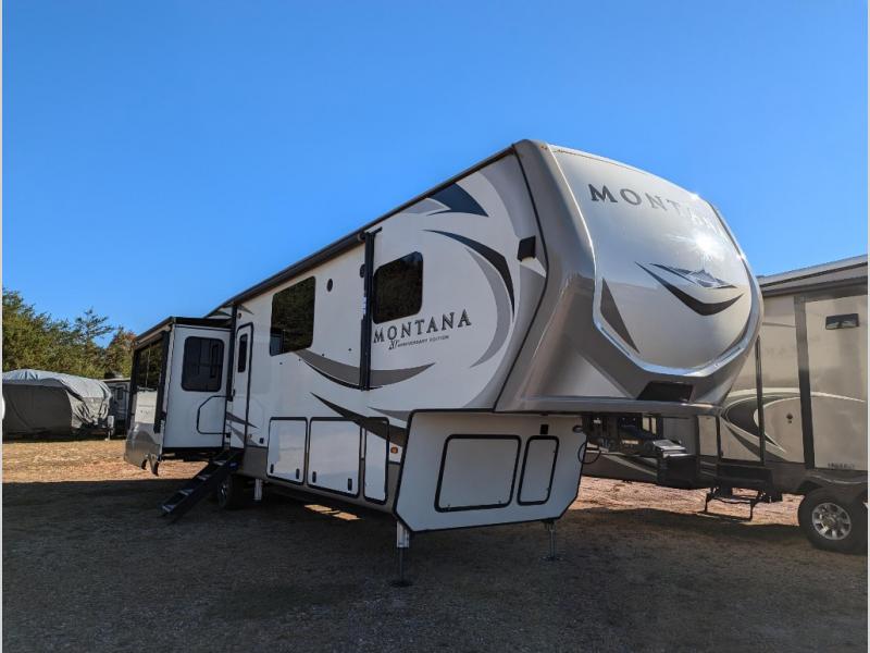 When packing for your next trip in a Keystone Montana luxury fifth wheel you will appreciate the enormous drop frame pass-through storage compartment, the MORyde "Step Above" entry steps with strut assist, and the LED light package including "super-bright" taillights with backup marker and off-door scare light. The Montana 20th Anniversary Edition adds exclusive features such as the Key TV satellite prep, LED accent lighting, Tru-fit slide construction, and Easy Sweep resilient flooring. You will love the in-floor heating ducts, which allow for more airflow to be distributed evenly for optimal comfort. the LED motion sensor light in the pass-through compartment and convenience center, plus the Four Season Living package allowing you to travel whenever you like. It's time to find the luxury fifth wheel you can enjoy for years to come, choose a Montana by Keystone today!