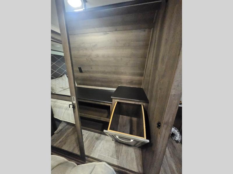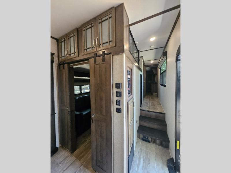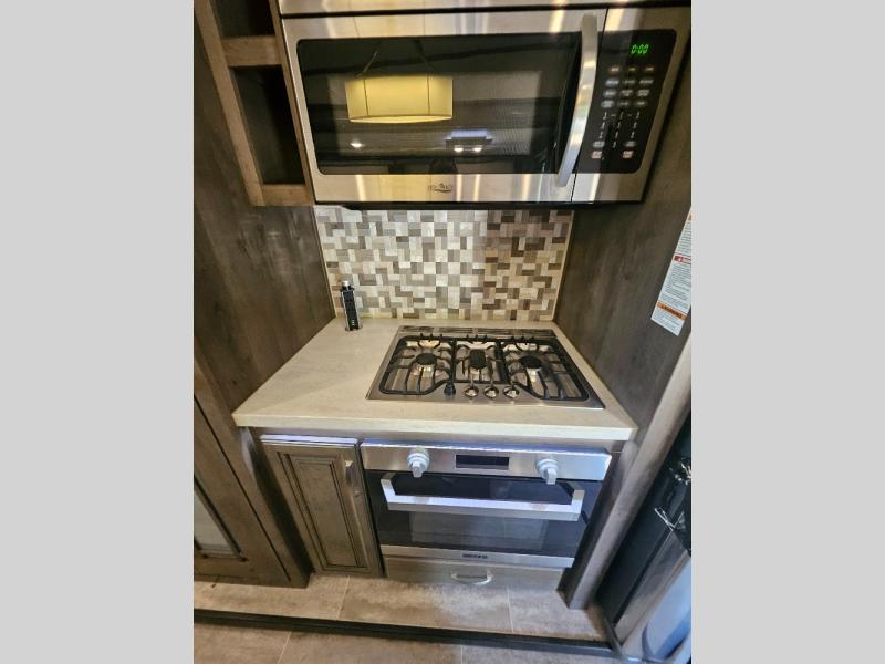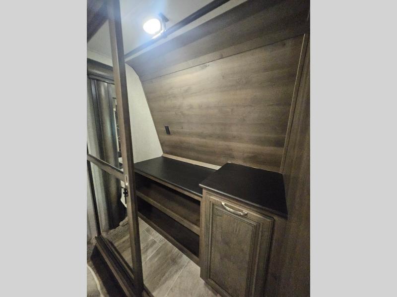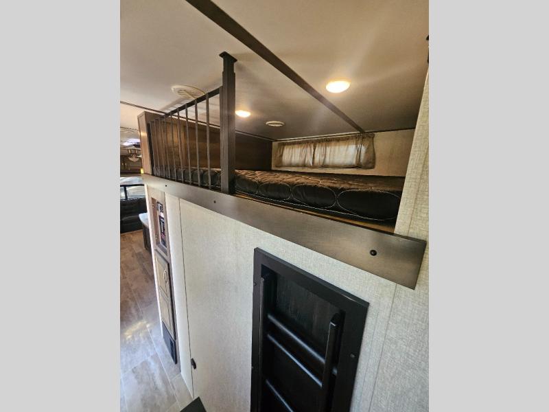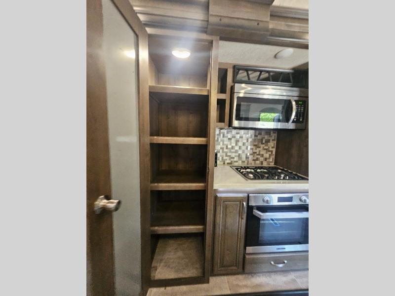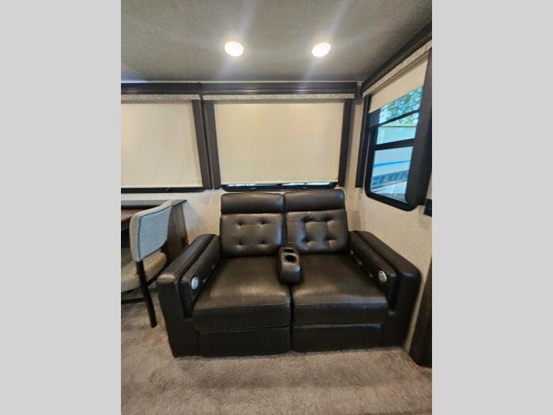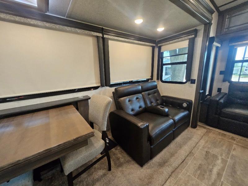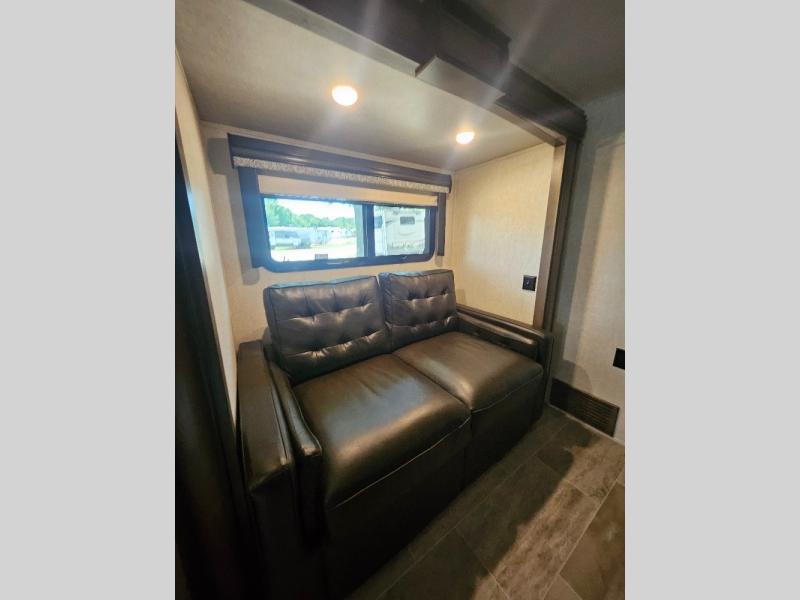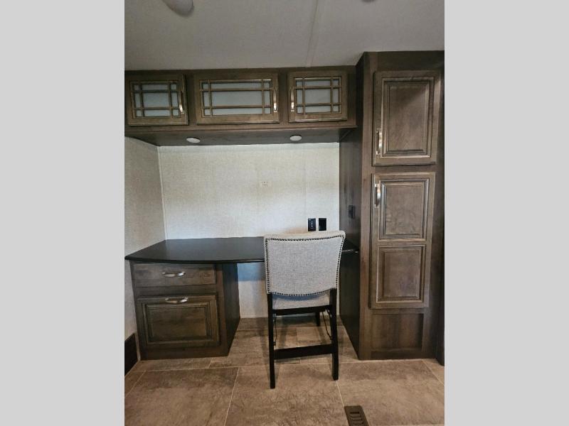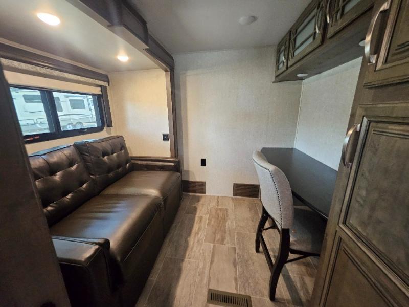 Full-timers love this fifth wheel including the new 20th anniversary edition enhancements! From the bonus room offering a hide-a-bed sofa and a desk which is quiet handy if you telecommute or your kids have homework, to the loft area offering storage and sleeping space, this Montana has it all for a couple or a family. Just imagine exploring outdoors to return to your own full kitchen including a residential refrigerator, large pantry and a kitchen island. The convection microwave comes in handy as well. You can relax on the furniture, and dine at free standing dinette while watching the HDTV and fireplace. The chairs can be moved to another room if needed. You might even choose to cook outdoors on the outside kitchen for several meals. This is the one!