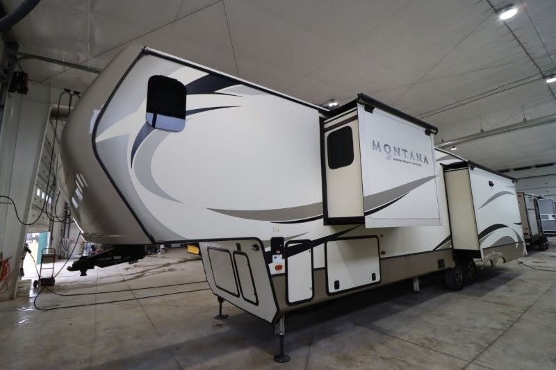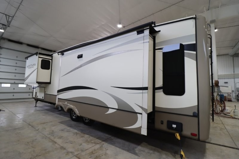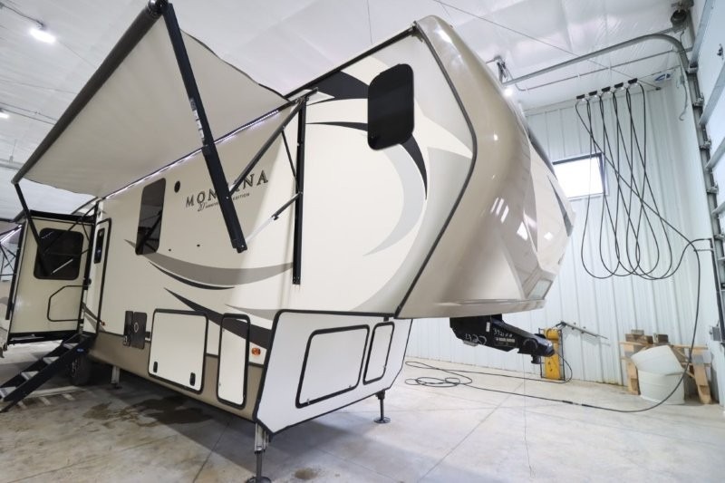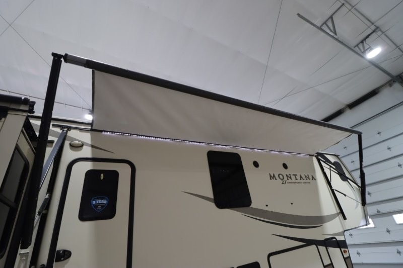 When packing for your next trip in a Keystone Montana luxury fifth wheel you will appreciate the enormous drop frame pass-through storage compartment, the MORyde "Step Above" entry steps with strut assist, and the LED light package including "super-bright" taillights with backup marker and off-door scare light. The Montana 20th Anniversary Edition adds exclusive features such as the Key TV satellite prep, LED accent lighting, Tru-fit slide construction, and Easy Sweep resilient flooring. You will love the in-floor heating ducts, which allow for more airflow to be distributed evenly for optimal comfort. the LED motion sensor light in the pass-through compartment and convenience center, plus the Four Season Living package allowing you to travel whenever you like. It's time to find the luxury fifth wheel you can enjoy for years to come, choose a Montana by Keystone today!