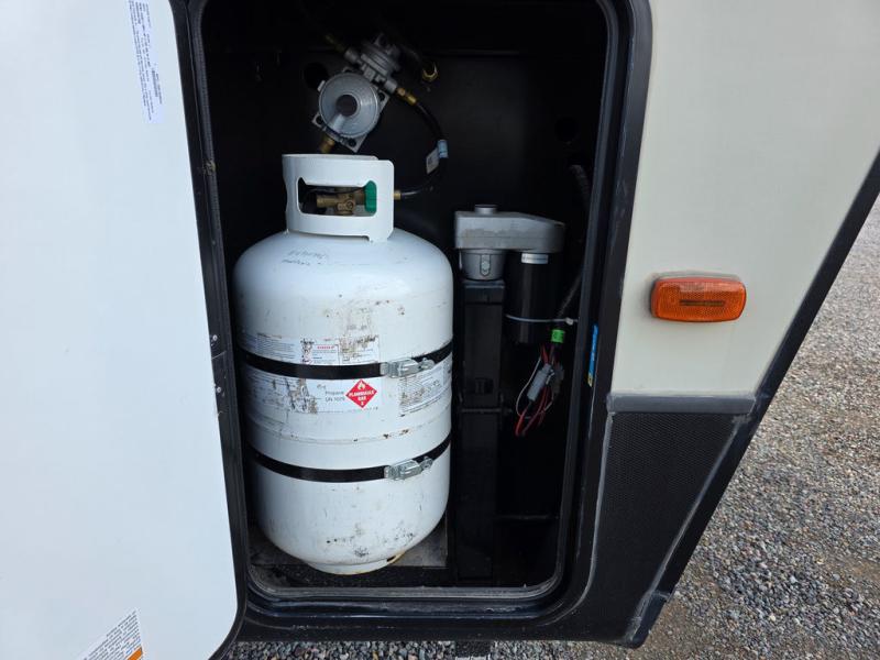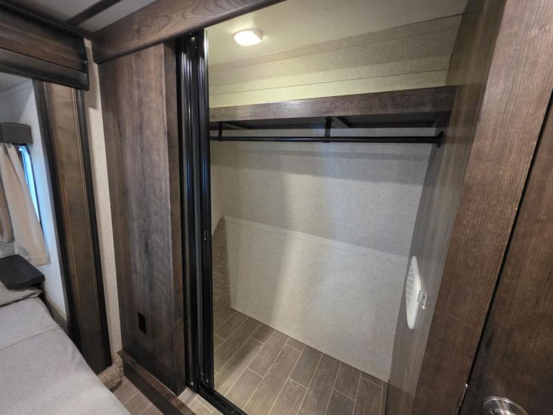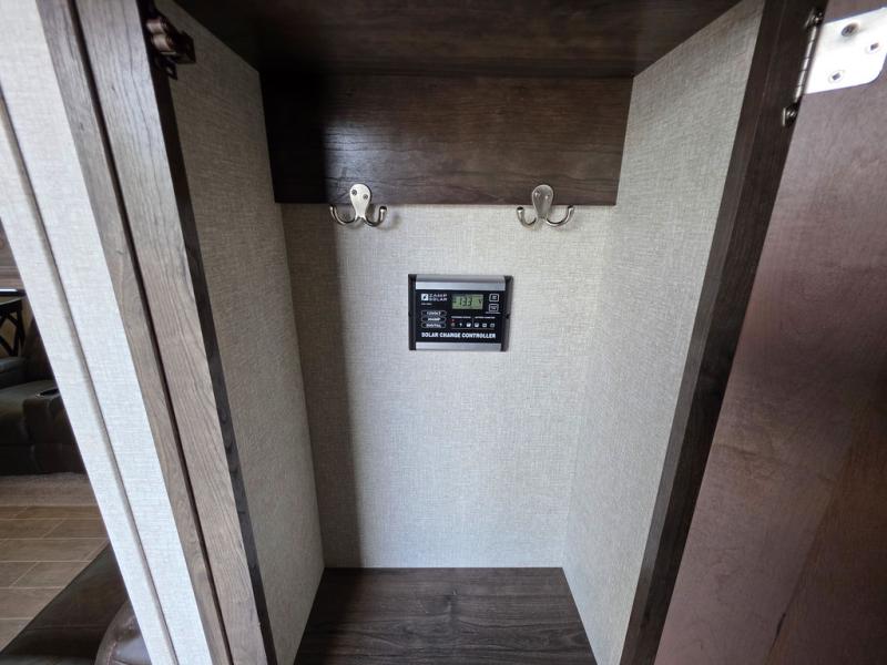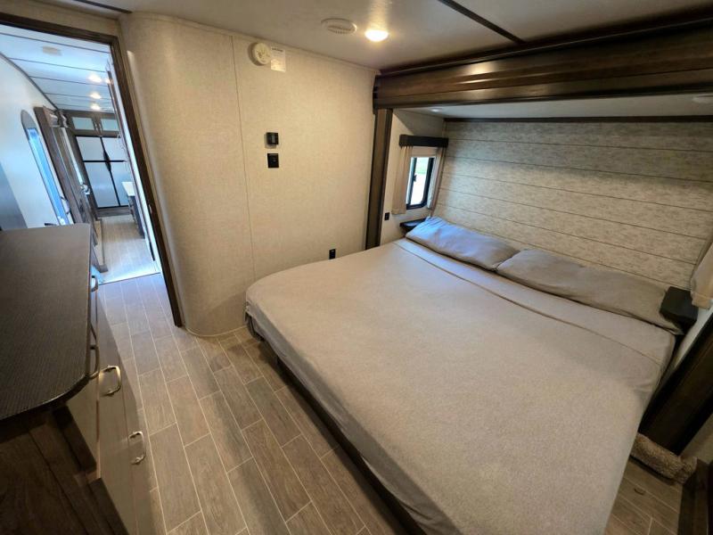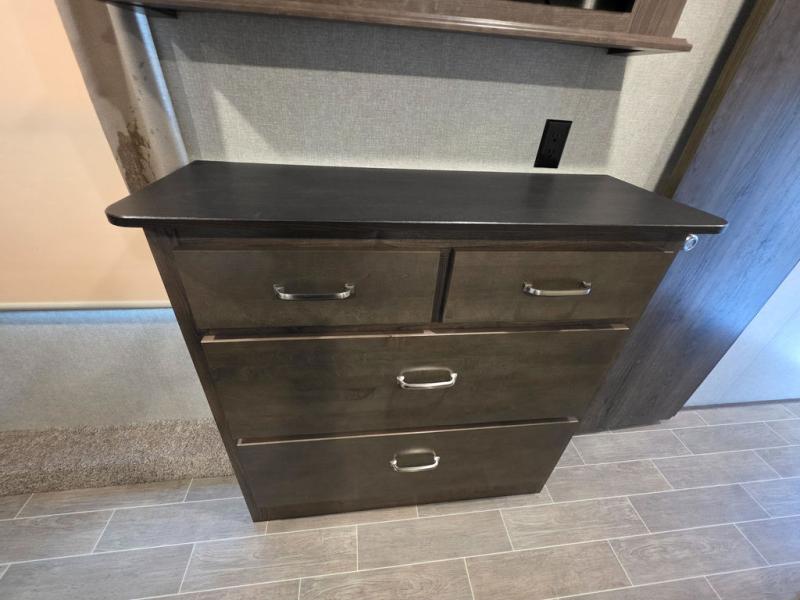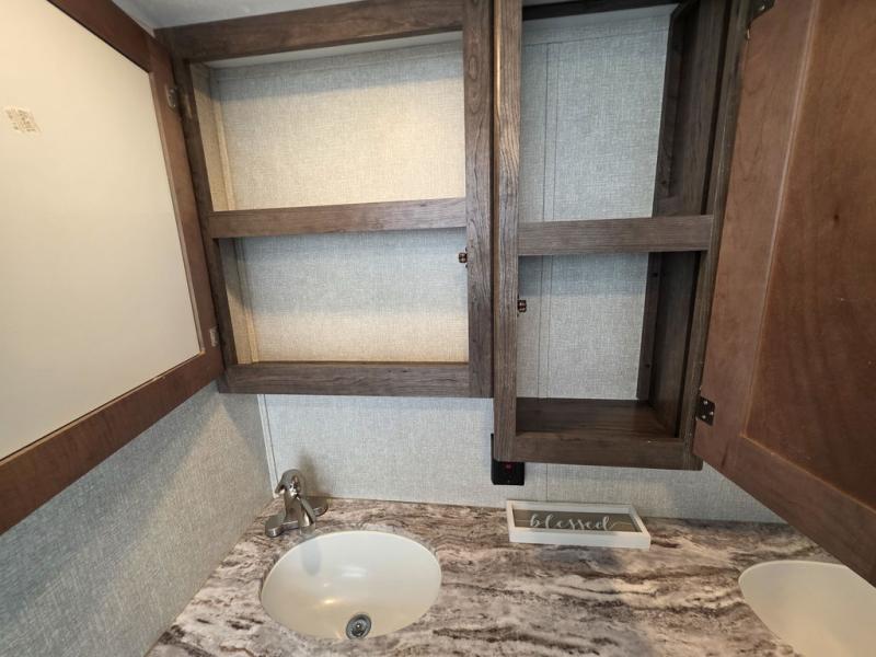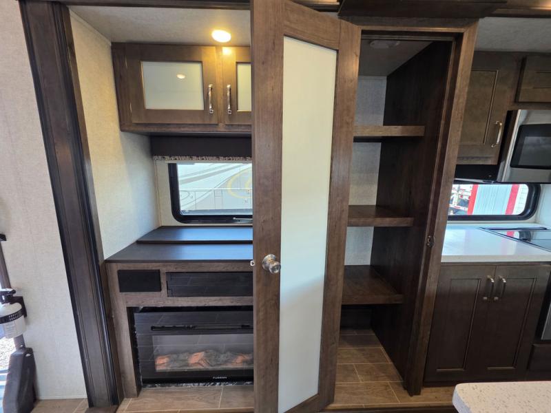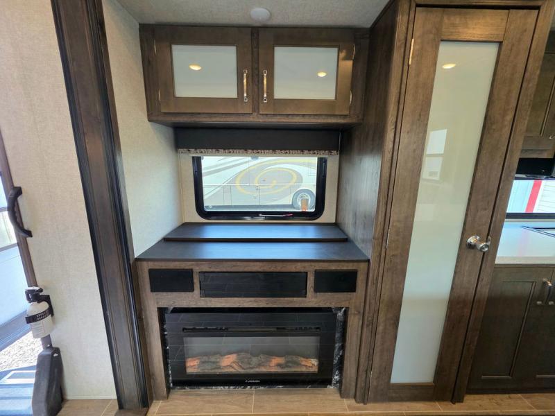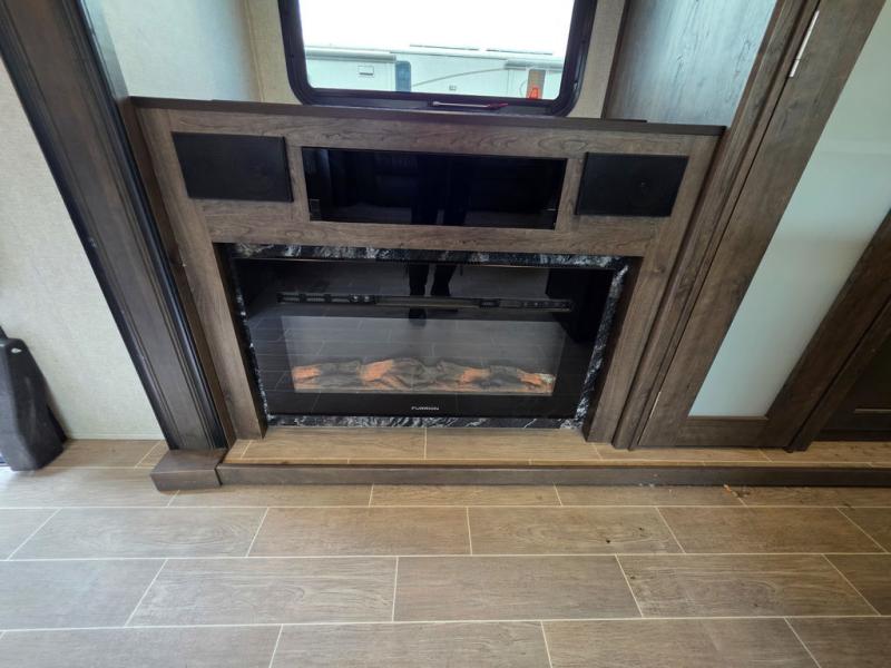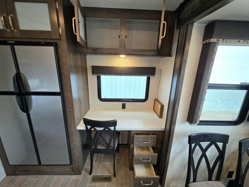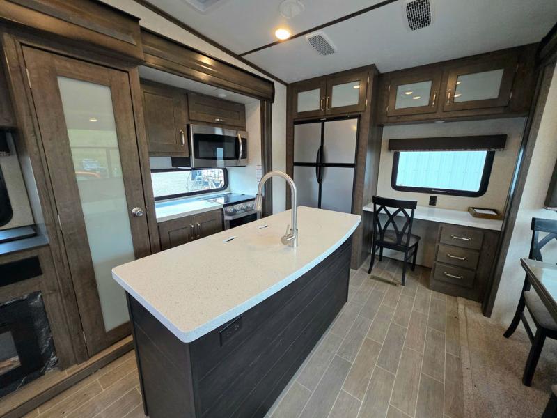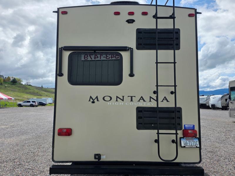 This Montana High Country is the perfect full time fifth wheel for couples that love to travel. The rear kitchen layout offers a 12 cu. ft. RV refrigerator and a residential microwave oven for all of your cooking needs. There is even a built-in desk for those who need to do a little work while away, or for those lucky telecommuting workers who can work from just about anywhere! For inside entertainment, you will enjoy the power theater seating opposite a cozy fireplace and telescoping HDTV. There is also a hide-a-bed sofa for more seating or sleeping space for guests who wish to stay for the night. A private front bedroom gives you a little space away from the main living area to retreat to when it is time for bed, and you will love the dual vanity sinks in the bathroom, as well as all of the storage space both inside and out!