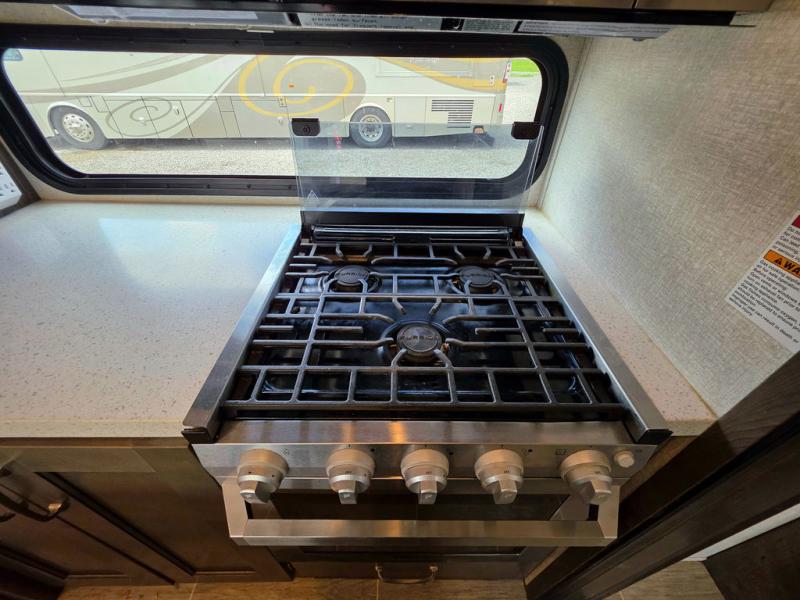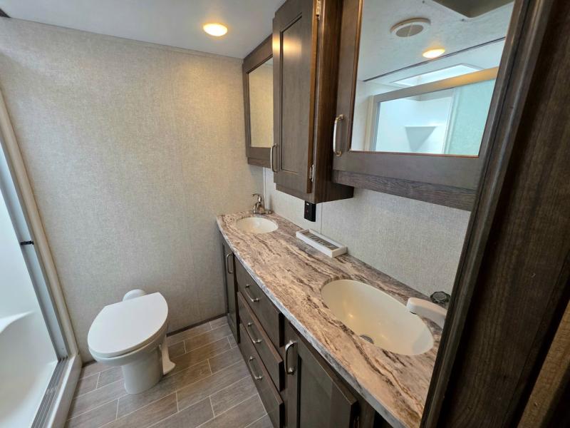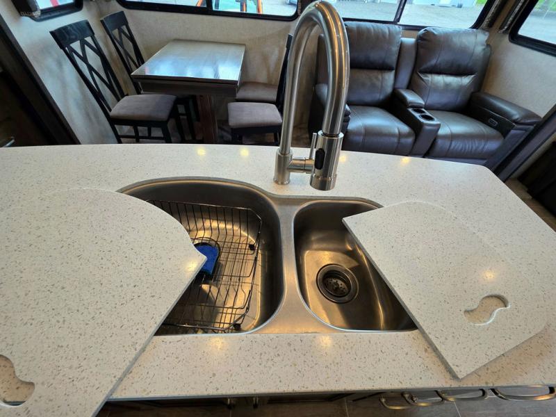 When heading out and setting up in a Keystone Montana High Country fifth wheel you will appreciate the Dexter E-Z Lube axles, Max Turn front cap and radius frame with Hitch Vision, and an enormous drop frame pass-through storage compartment to name a few features. Inside you will find luxury and comfort with the 78" tall main slide outs and flush mounted LED interior lights. The bath features a skylight over the shower, seamless countertops, and a vanity with three drawers for extra storage space!. The chef of the family is going to love the Montana High Country's kitchen with its Furrion 21" two in one stainless steel cooktop and oven, a 30" over-the-range microwave, solid surface countertops, and a high-rise faucet with an integrated pull-out sprayer, plus so much more!
