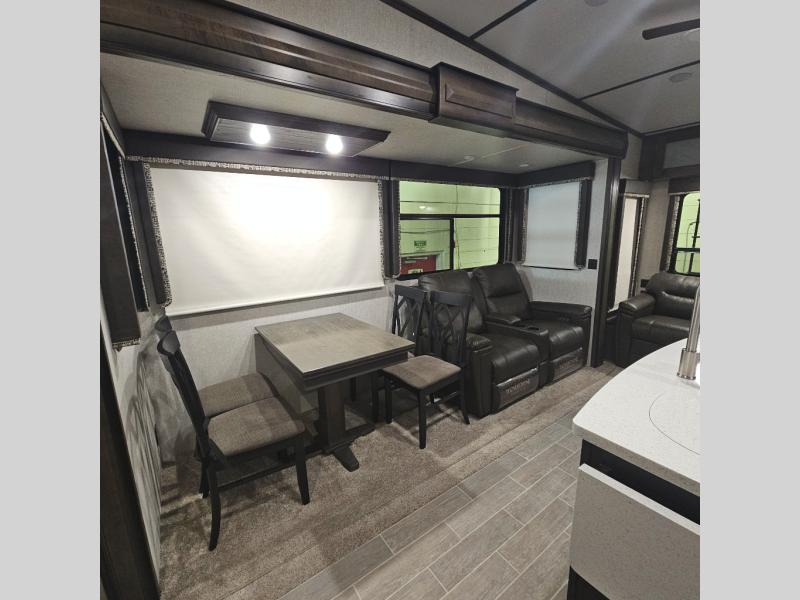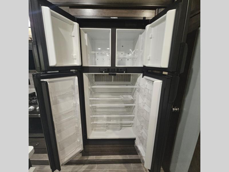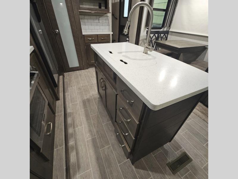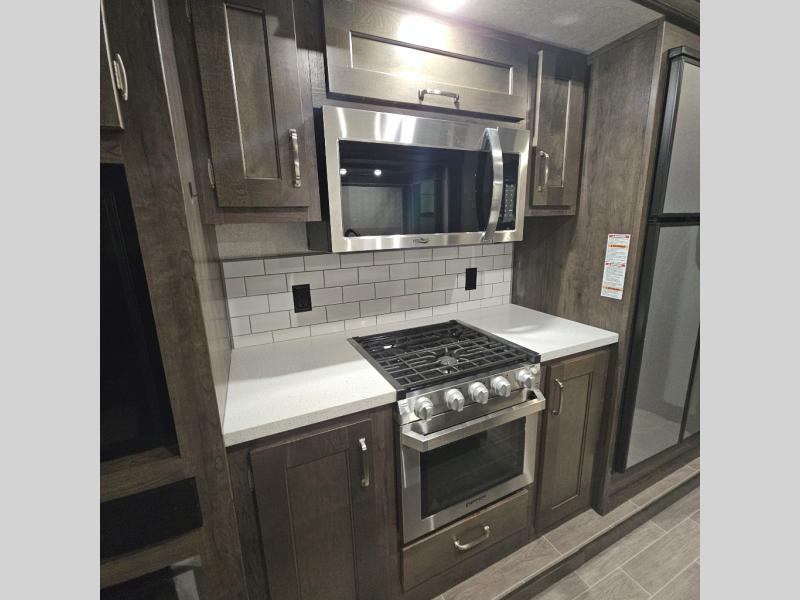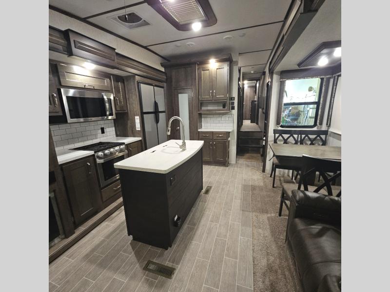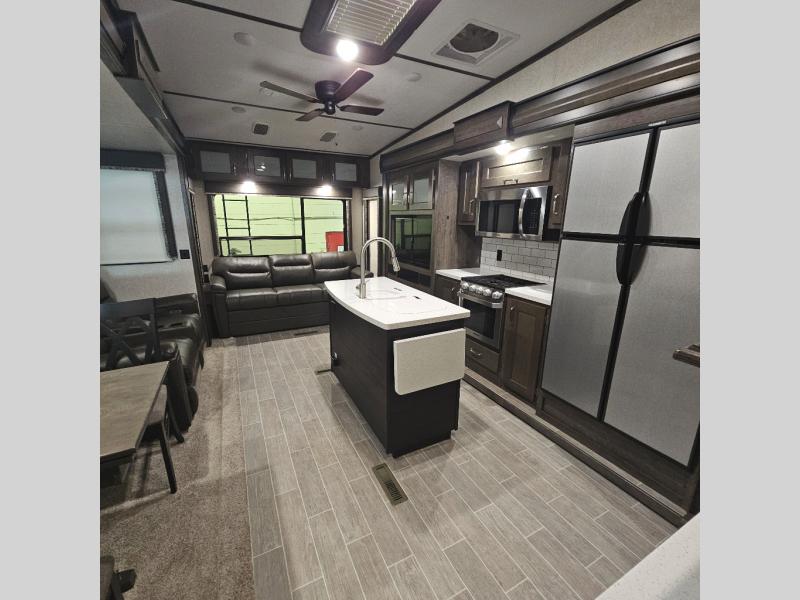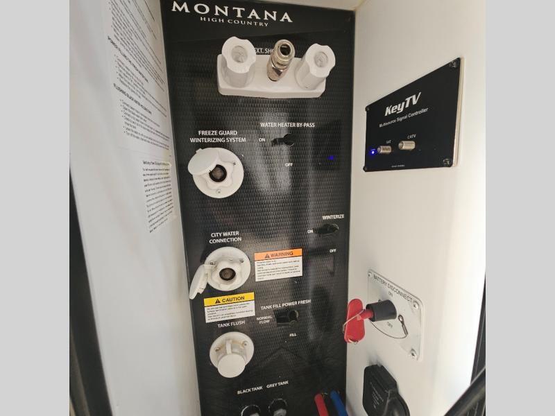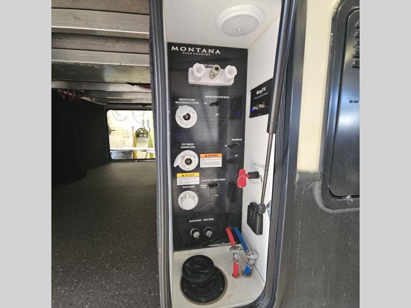 When heading out and setting up in a Keystone Montana High Country fifth wheel you will appreciate the Dexter E-Z Lube axles, Max Turn front cap and radius frame with Hitch Vision, and an enormous drop frame pass-through storage compartment to name a few features. Inside you will find luxury and comfort with the 78" tall main slide outs and flush mounted LED interior lights. The bath features a skylight over the shower, seamless countertops, and a vanity with three drawers for extra storage space!. The chef of the family is going to love the Montana High Country's kitchen with its Furrion 21" two in one stainless steel cooktop and oven, a 30" over-the-range microwave, solid surface countertops, and a high-rise faucet with an integrated pull-out sprayer, plus so much more!