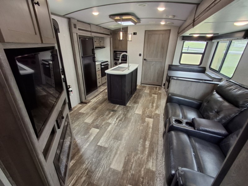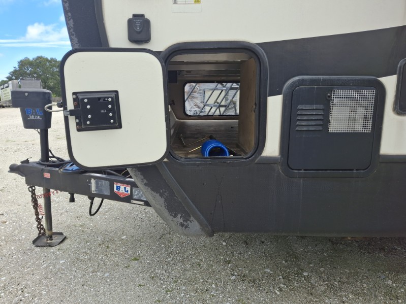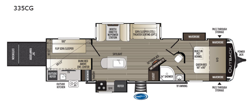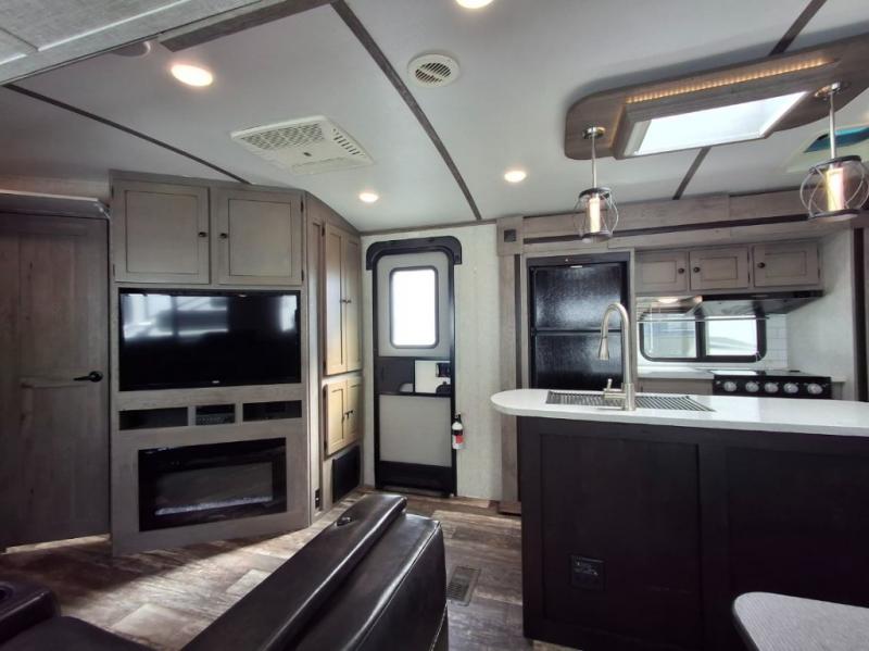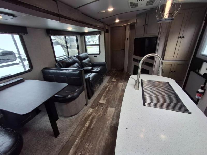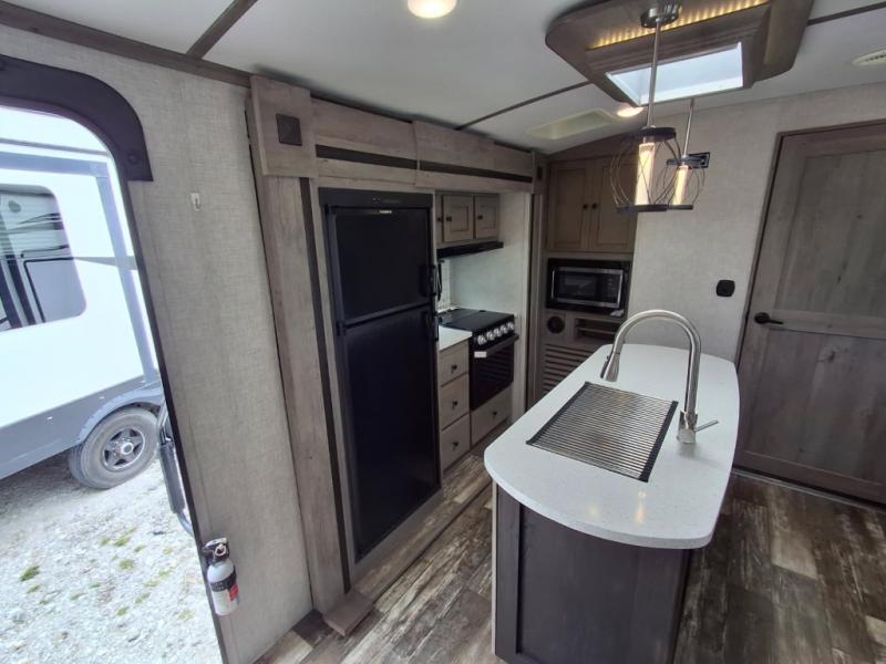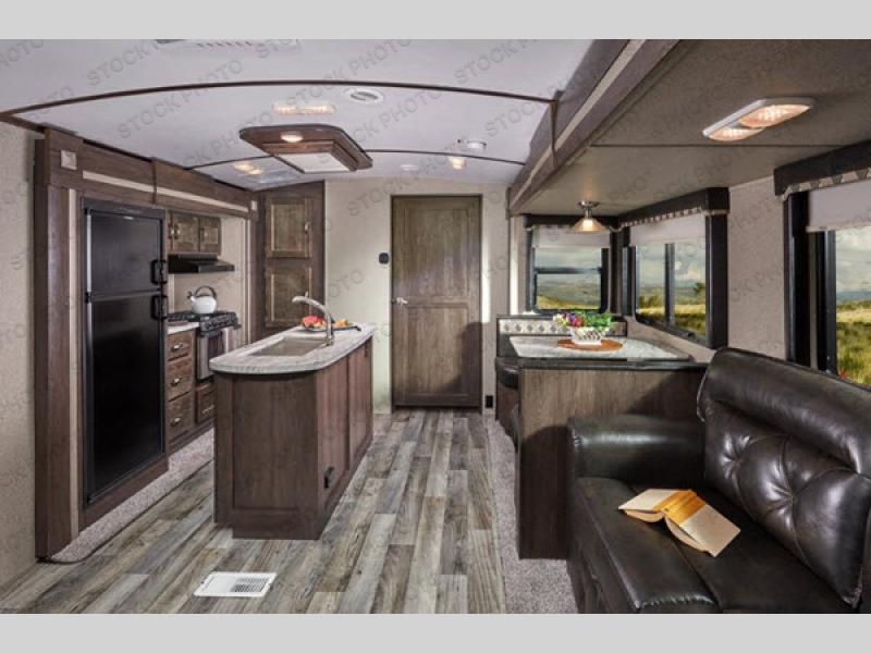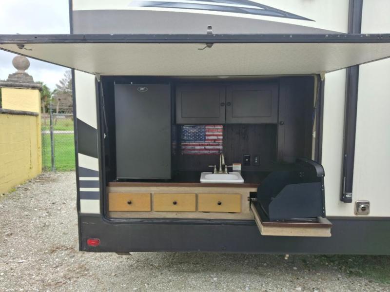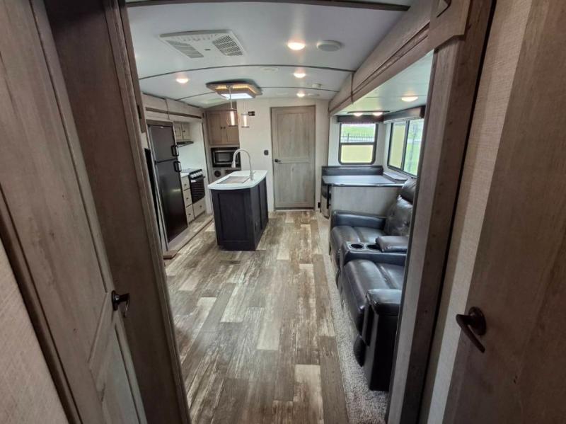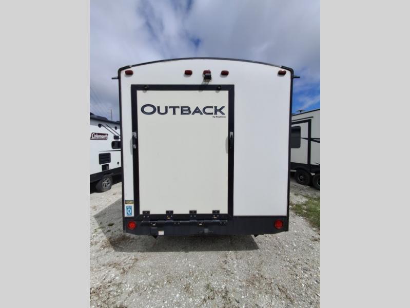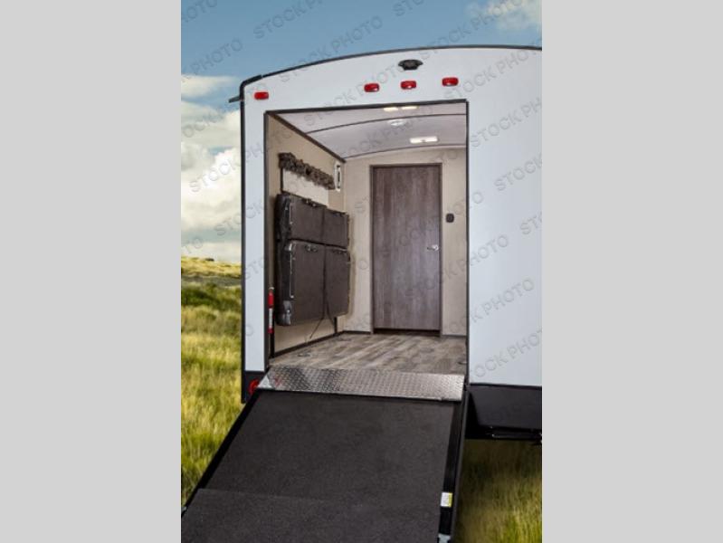 This Outback toy hauler is a fully equipped unit that has an exterior pass-through storage which will hold most of your gear that you need to set up and tear down, as well as some outdoor games or extra luggage. The separate garage area, where you will store your toys as you travel, has its own space with a private entry into the central living area and a flip-down sofa sleeper with a bunk bed above the entertainment center. You will thoroughly enjoy the freedom of the outdoor kitchen that includes a refrigerator, a two-burner stove, and a sink, and preparing a hearty dinner in the interior full kitchen will be a breeze with the help of the kitchen island and large pantry.