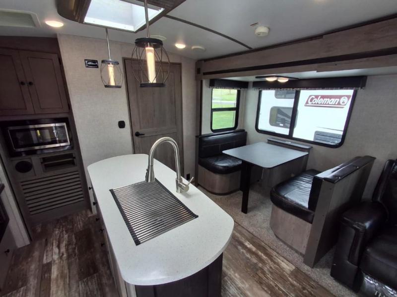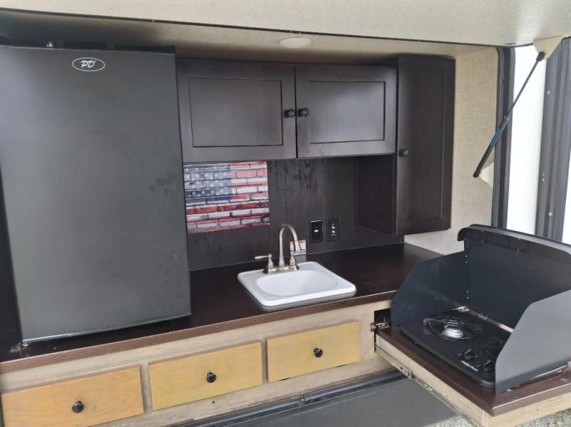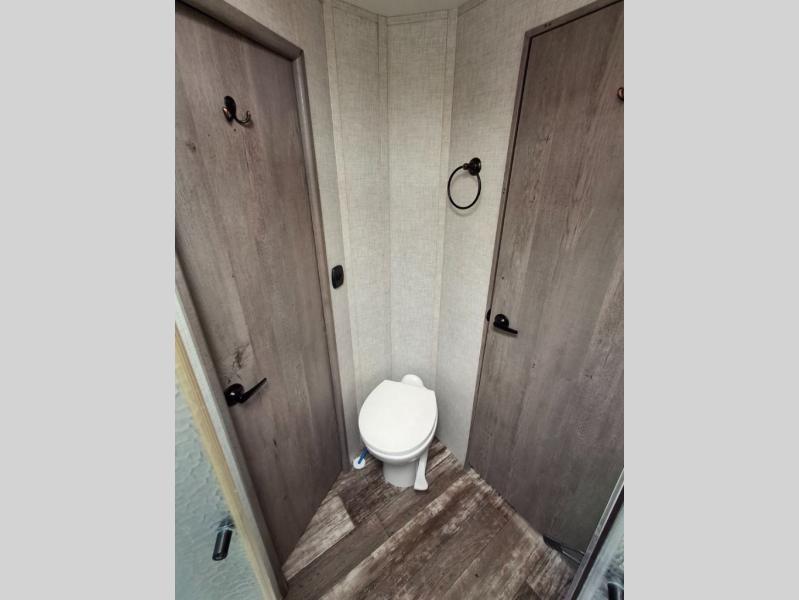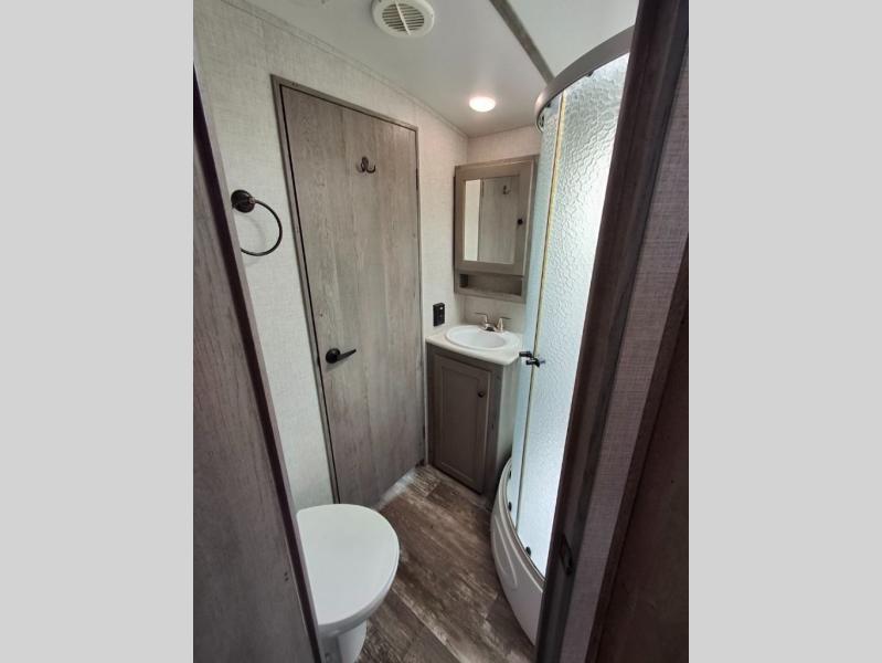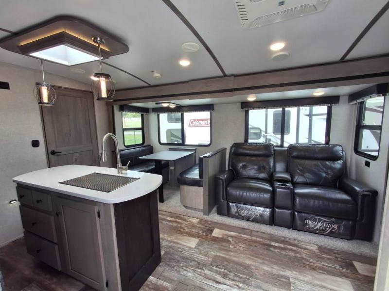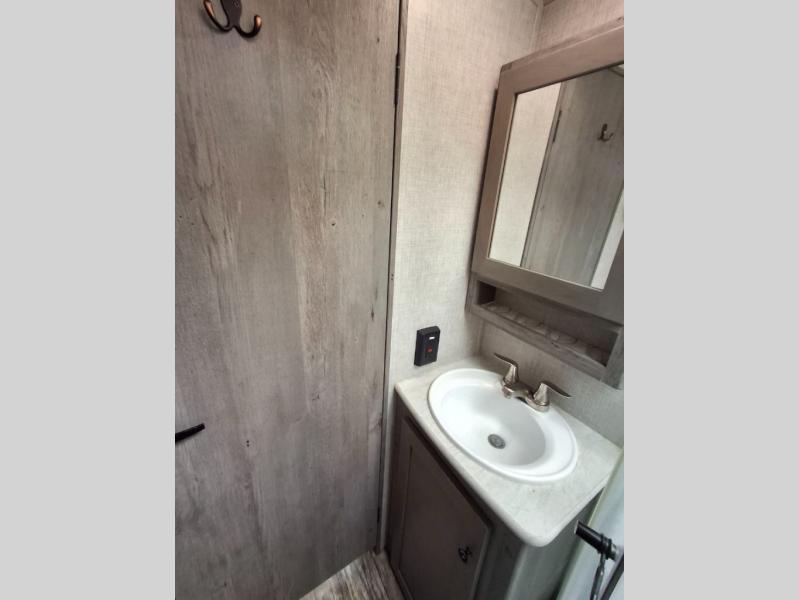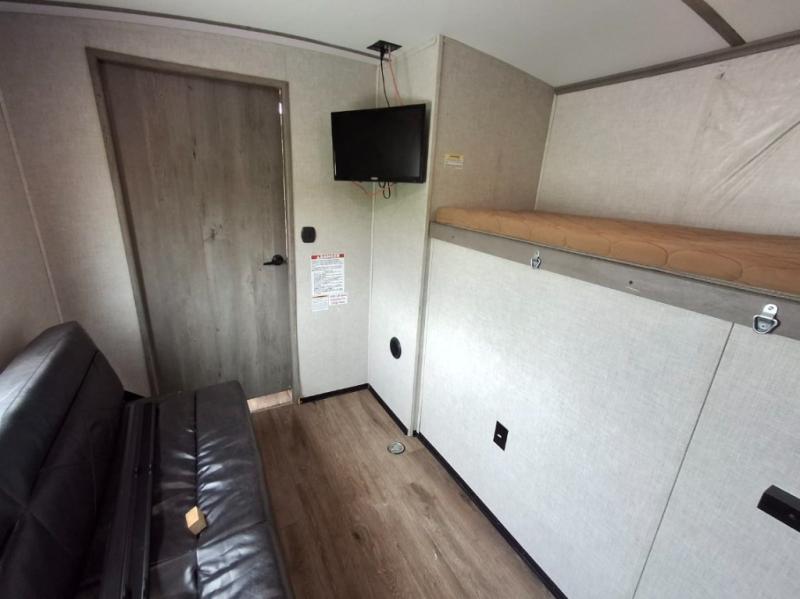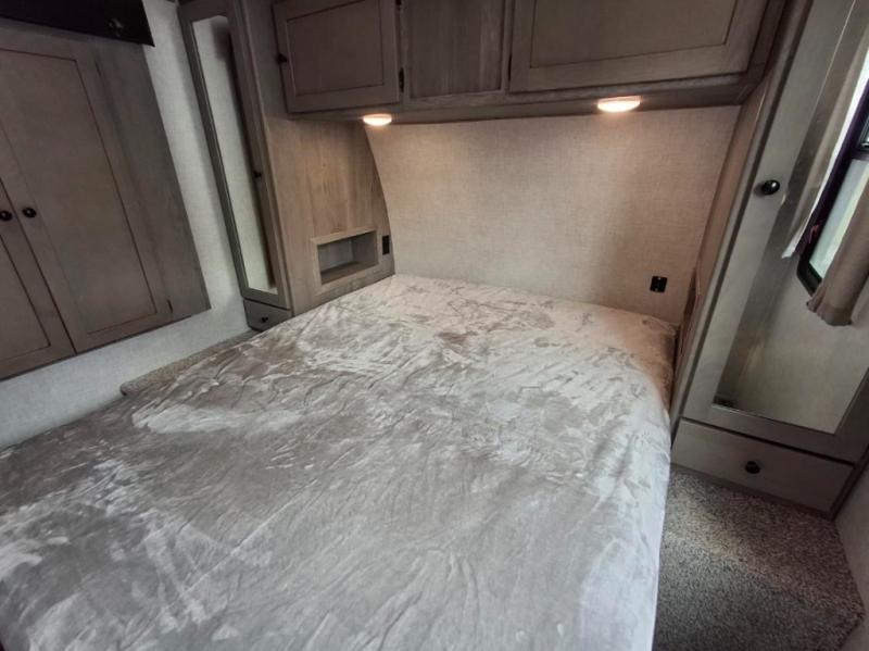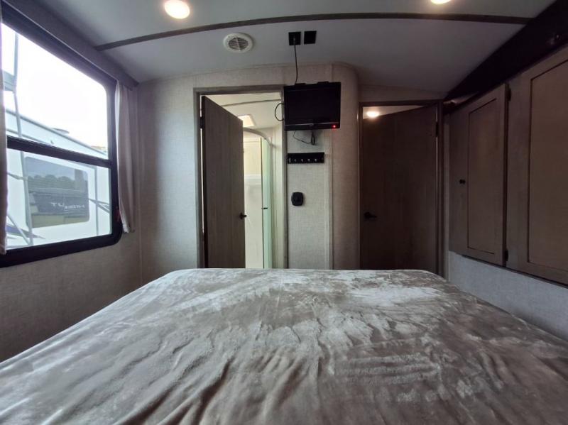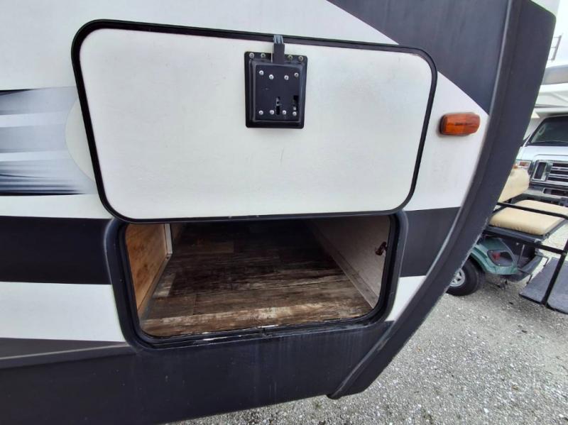 This Outback toy hauler is a fully equipped unit that has an exterior pass-through storage which will hold most of your gear that you need to set up and tear down, as well as some outdoor games or extra luggage. The separate garage area, where you will store your toys as you travel, has its own space with a private entry into the central living area and a flip-down sofa sleeper with a bunk bed above the entertainment center. You will thoroughly enjoy the freedom of the outdoor kitchen that includes a refrigerator, a two-burner stove, and a sink, and preparing a hearty dinner in the interior full kitchen will be a breeze with the help of the kitchen island and large pantry.