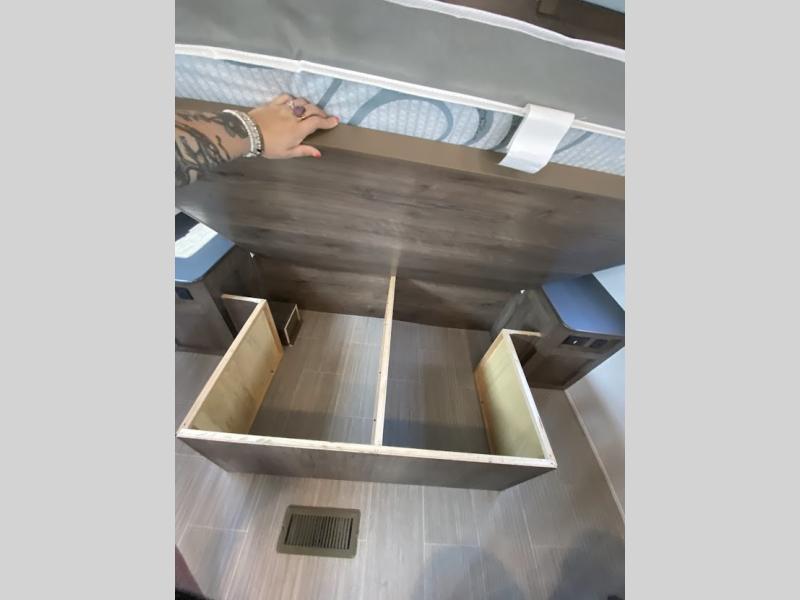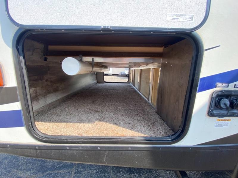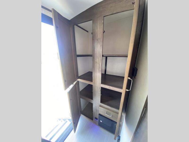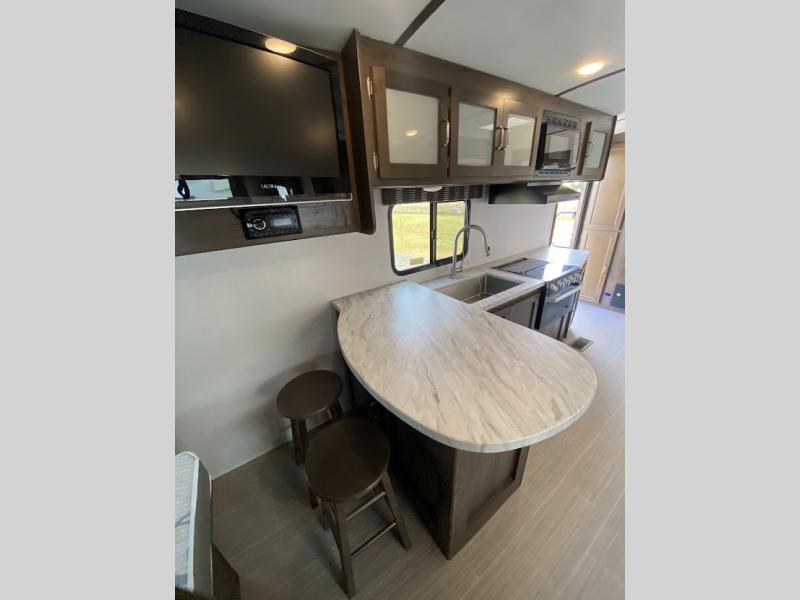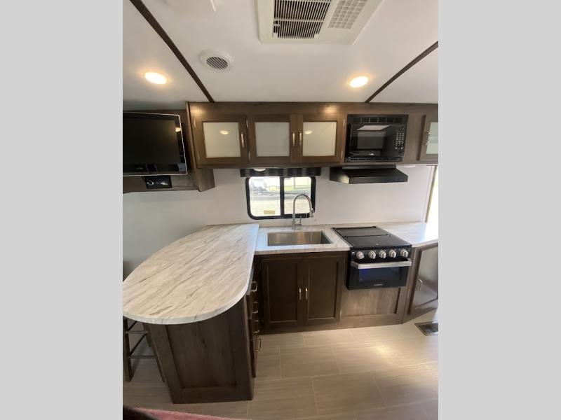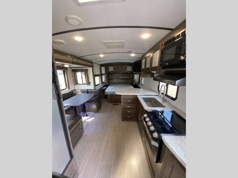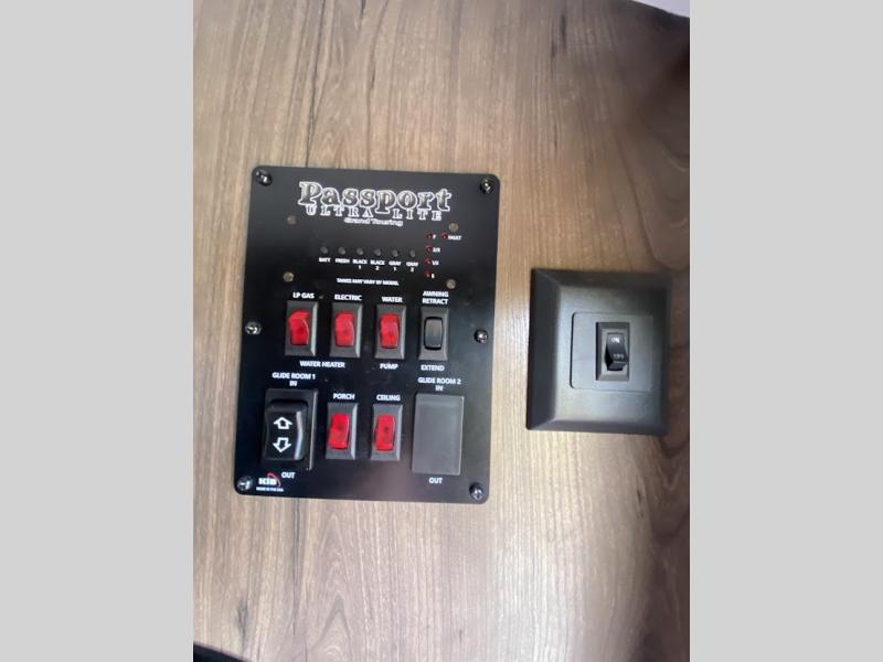 This Passport Grand Touring travel trailer allows you take along lots of gear thanks to all the storage areas throughout including the exterior pass-through compartment for those larger items. You and your spouse will enjoy relaxing or hosting a card game at the U-shaped dinette, and preparing meals or eating at the L-shaped, curved counter with chairs. You will be able to skip the public facilities thanks to the full rear bath, and stay rested on the walk-around queen bed. This model even sleeps four if you want to invite overnight guests. Take a look, you will be a happy camper!