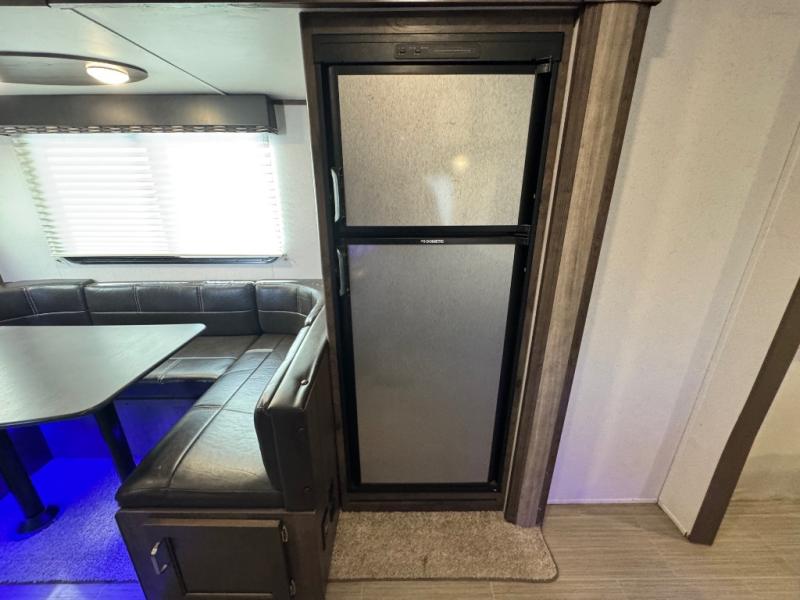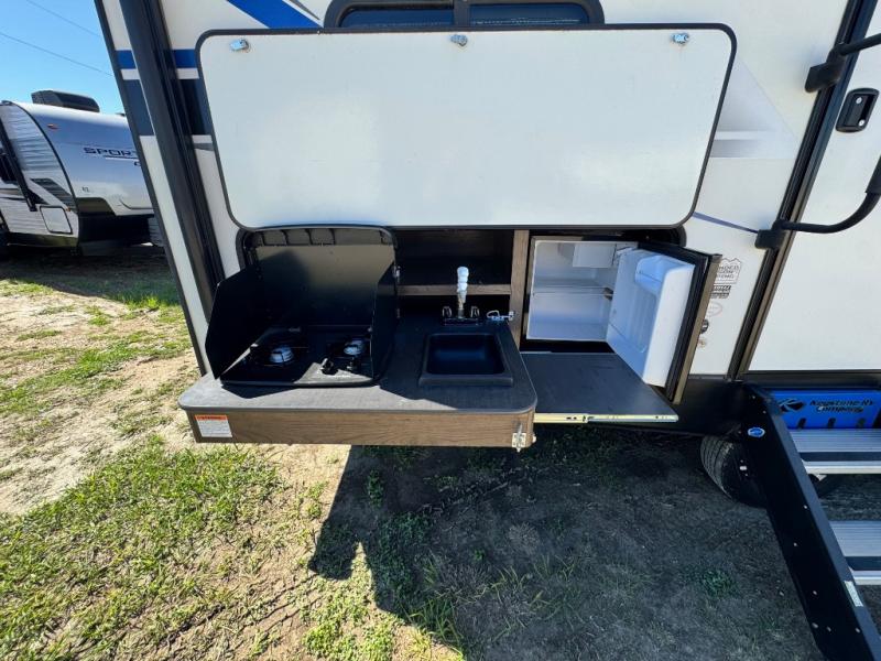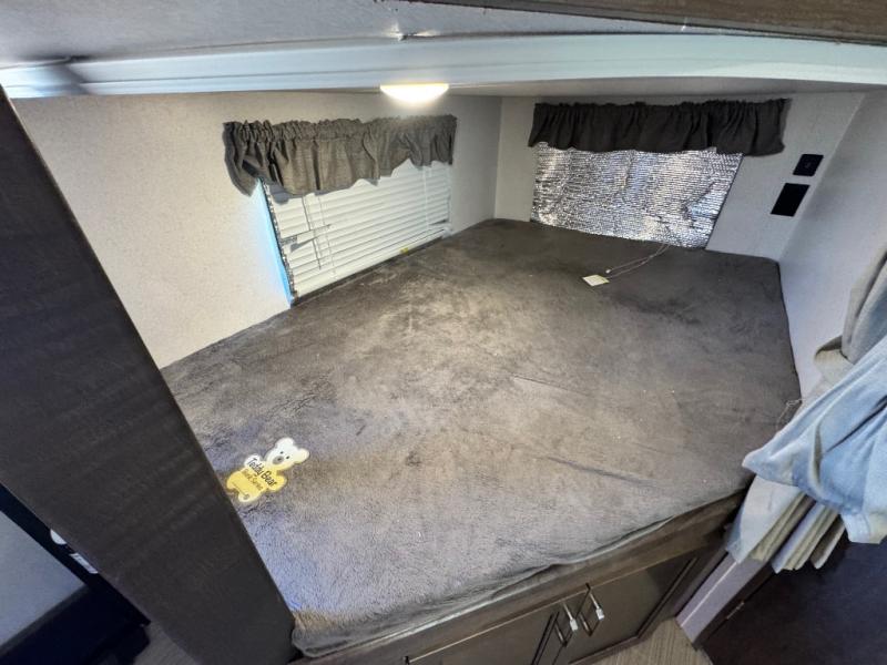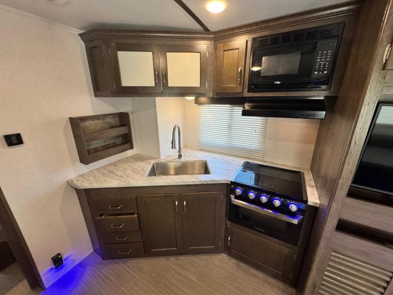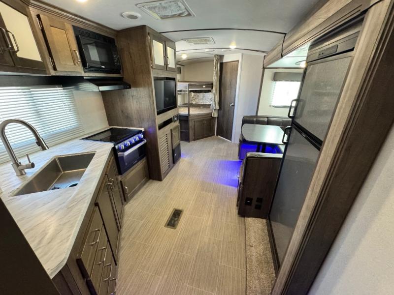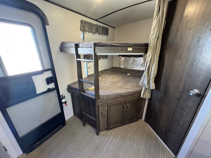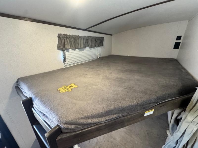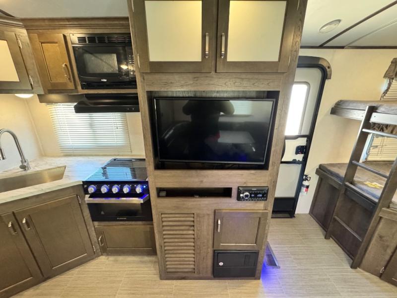 After hiking and biking around the campgrounds you can return to your own travel trailer to make dinner on the outdoor kitchen, or the indoor kitchen with full amenities. The main living area will allow everyone to eat around the U-shaped dinette while watching the flat screen TV if you aren't outdoors enjoying the cool weather. The kids can draw straws to decide which of the two double size bunks will be theirs for the weekend. Your spouse can choose their favorite side of the queen bed while you unload the extra large gear in the pass-through storage. Come see even more features you will love!