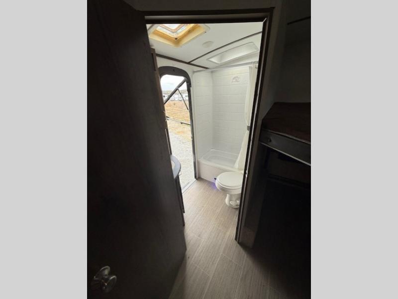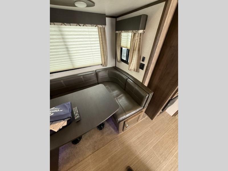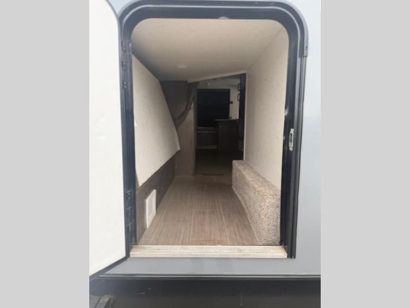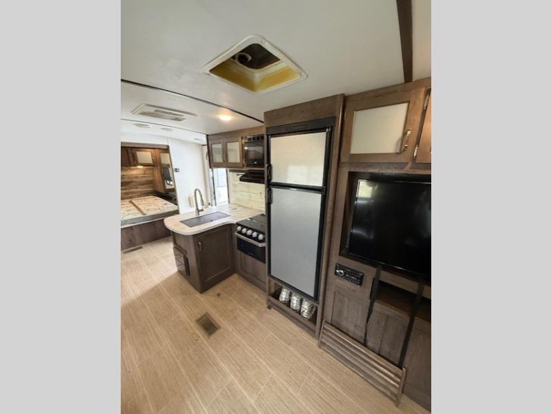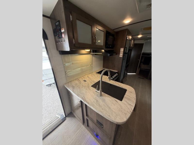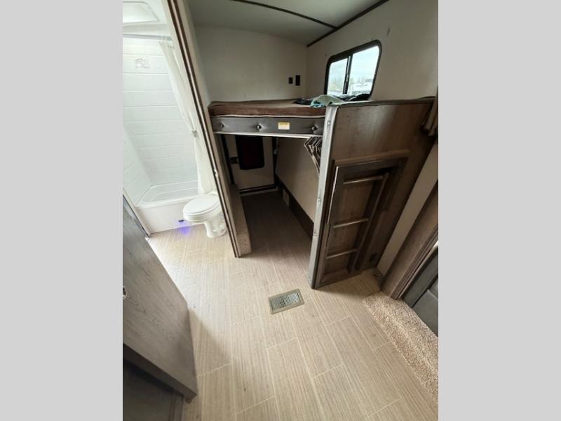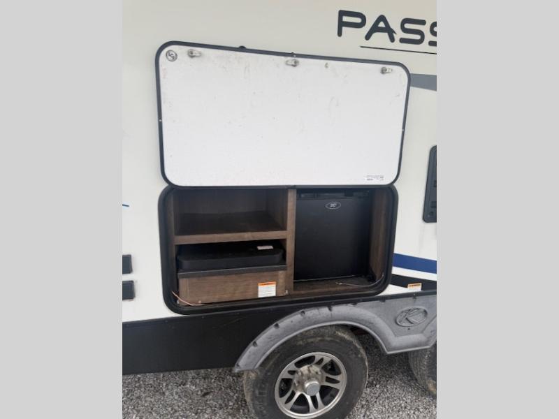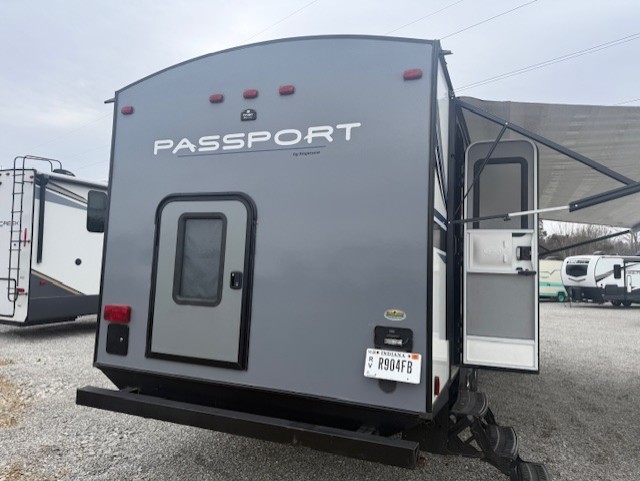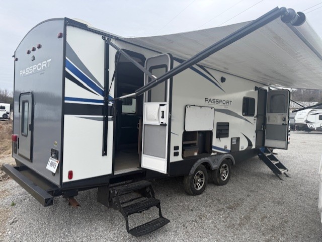 Can you envision your kids playing outside around the campsite while you cook meals on the outdoor kitchen? Your spouse will probably be sitting in a camp chair under the awning. This Passport travel trailer will be perfect for your cooking preference, your spouse's relaxing idea, and your kids' sleeping arrangements. When it's time for bedtime, you can retire to your own master bedroom up front via the main entrance, and the kids can head to their own bunk beds in the rear through the exterior bathroom entrance. The bottom bunk even flips up so you can store items when traveling down the road such as extra totes or bicycles. Storage is no issue in the kitchen, or bedroom which includes dual wardrobes. And the larger outdoor gear can be stowed away nicely in the pass-through compartment. Load up your family and start exploring today!
