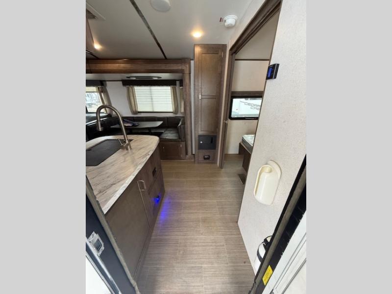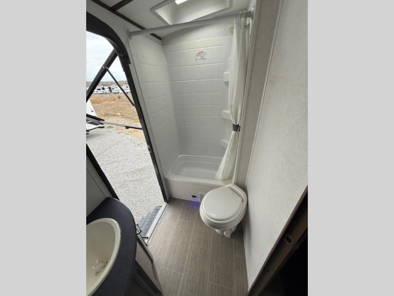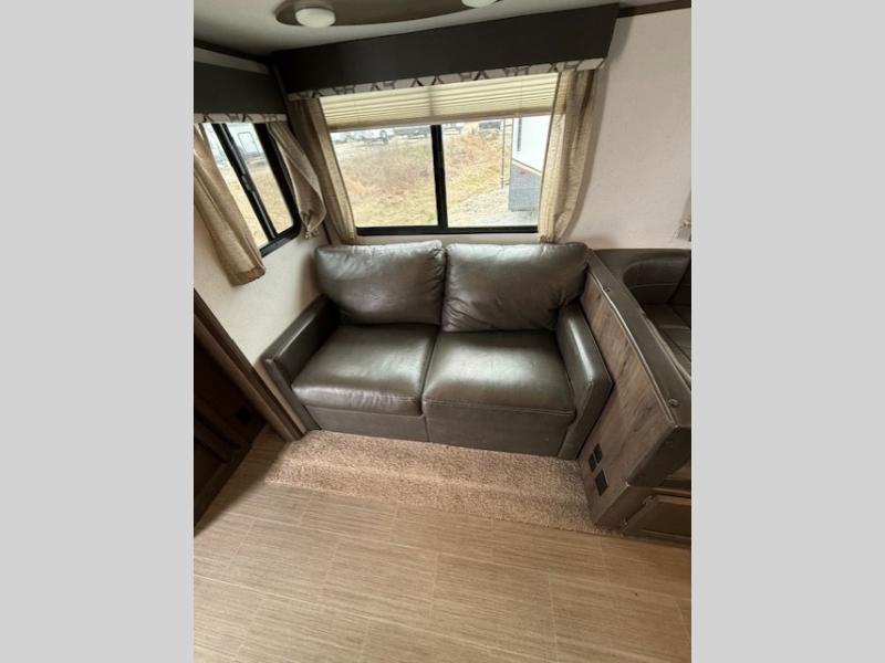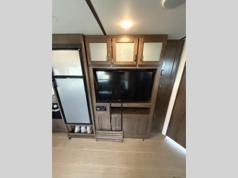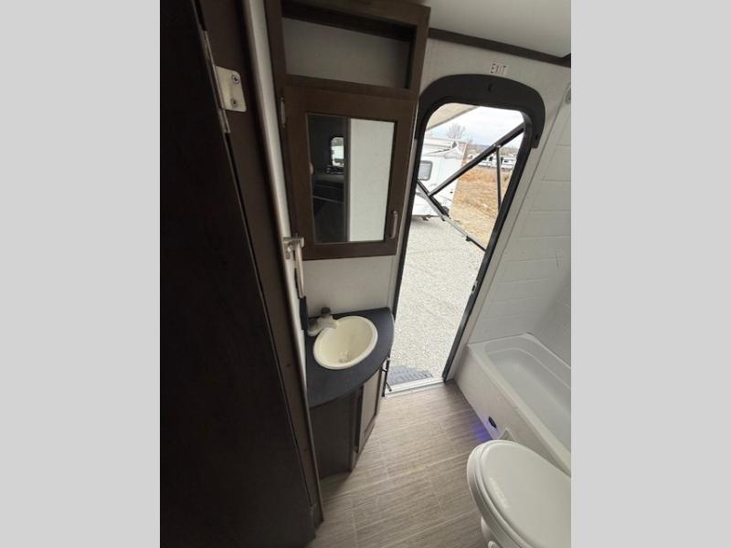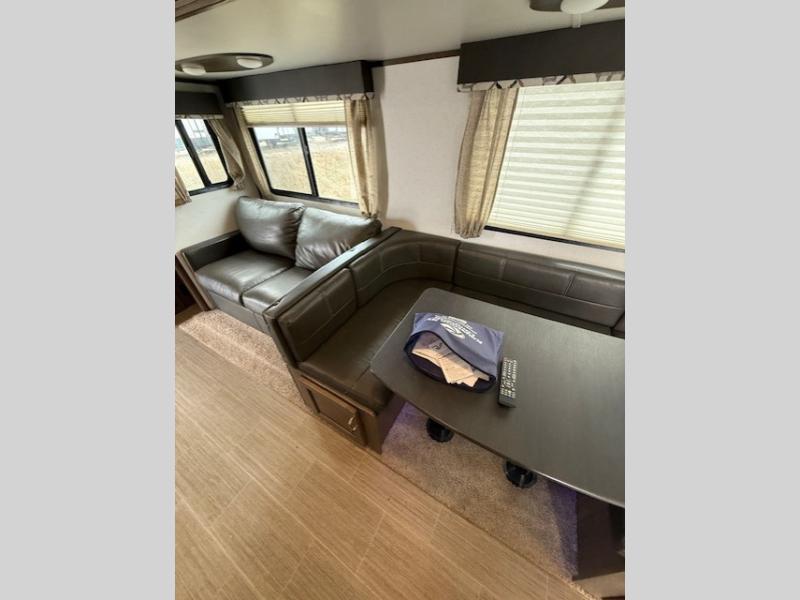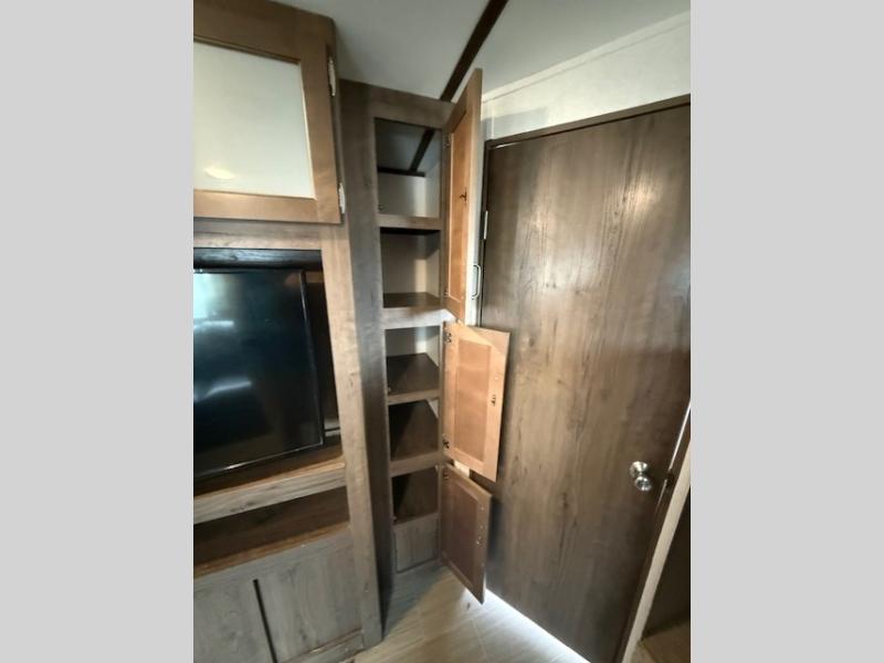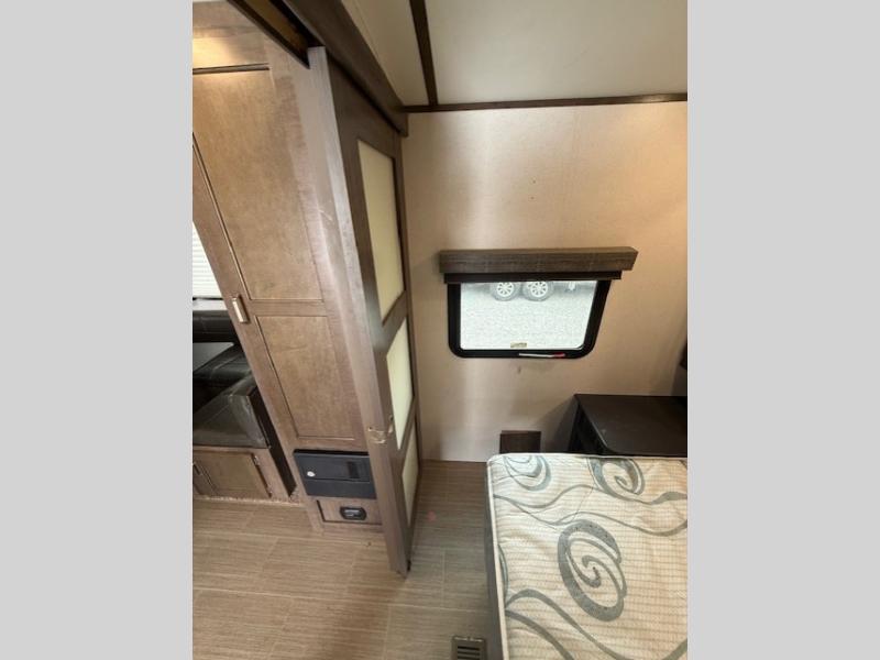 Can you envision your kids playing outside around the campsite while you cook meals on the outdoor kitchen? Your spouse will probably be sitting in a camp chair under the awning. This Passport travel trailer will be perfect for your cooking preference, your spouse's relaxing idea, and your kids' sleeping arrangements. When it's time for bedtime, you can retire to your own master bedroom up front via the main entrance, and the kids can head to their own bunk beds in the rear through the exterior bathroom entrance. The bottom bunk even flips up so you can store items when traveling down the road such as extra totes or bicycles. Storage is no issue in the kitchen, or bedroom which includes dual wardrobes. And the larger outdoor gear can be stowed away nicely in the pass-through compartment. Load up your family and start exploring today!