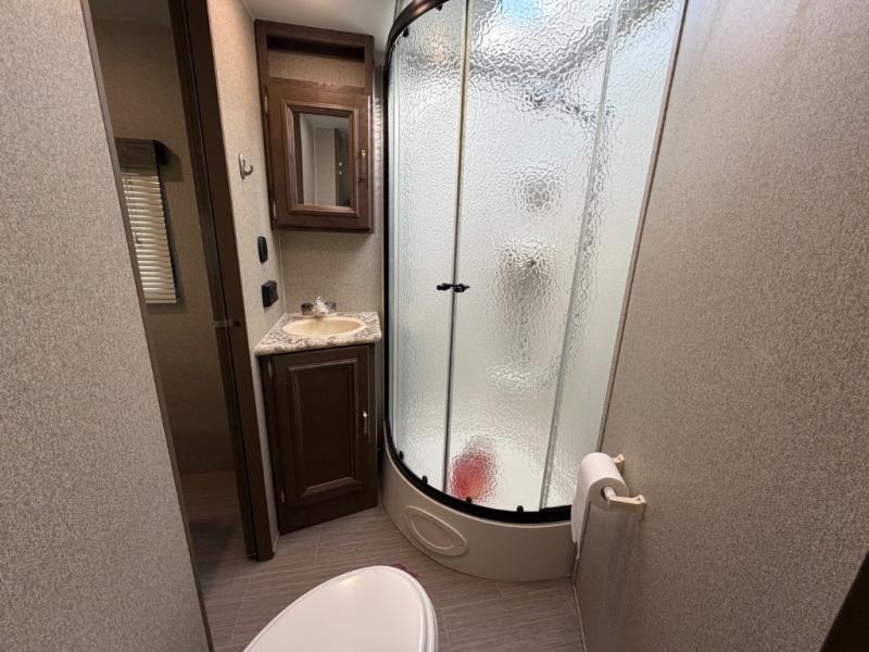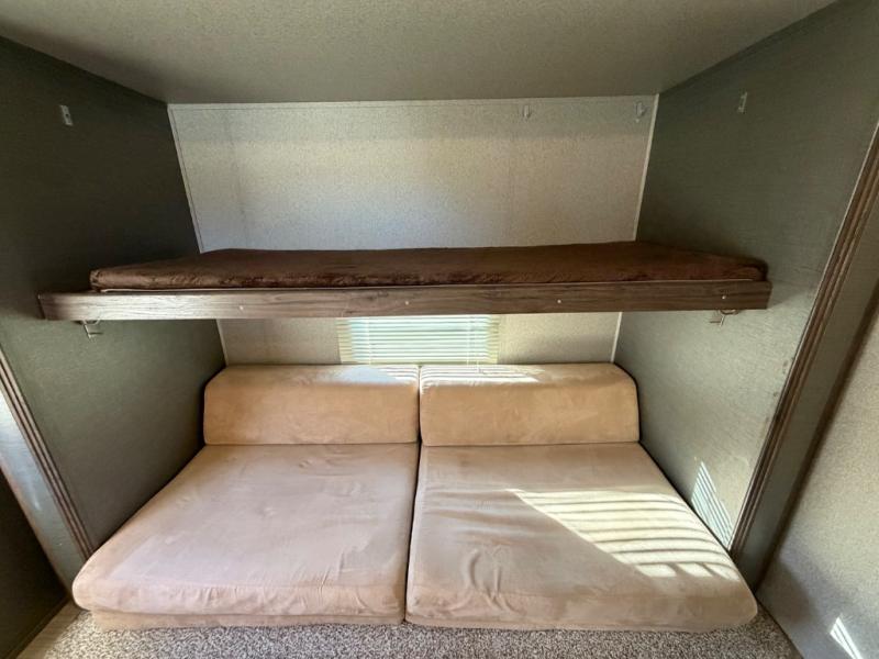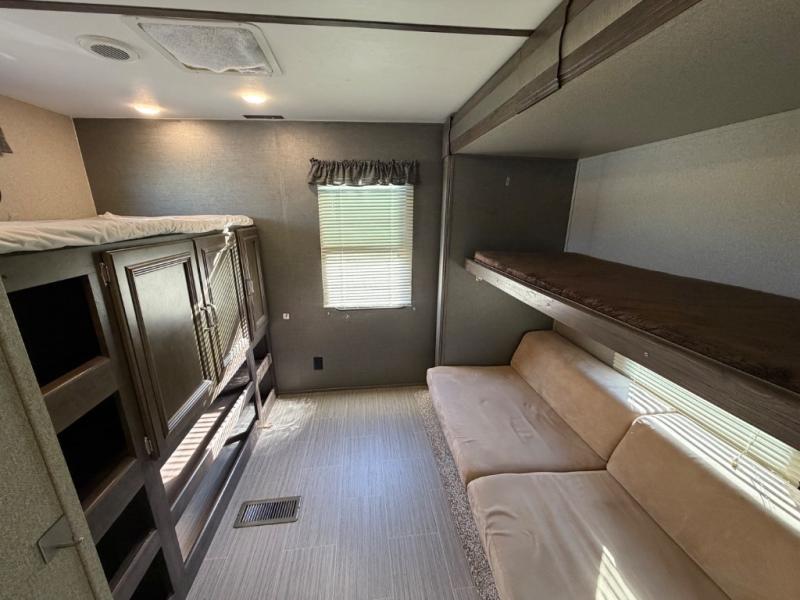 A spacious bunkhouse for the kids, a bath and a half, plus an outside kitchen are the perfect features for the outdoor enthusiast and his family. You can only imagine how much fun you will have hanging out at the campfire, hiking the trails, and playing games inside on the U-shaped dinette. This Passport 3350BH Grand Touring travel trailer offers plenty of walking around room thanks to the dual slides and two exterior entry doors. The cook has the choice of making meals inside, or outside on the outdoor kitchen. The convenience center inside the main entry, the storage throughout, and the exterior pass-through compartment allows you to carry all of your gear, plus some! If you are seeking a spacious RV with plenty of sleeping space for nine to ten sleepy campers, and enjoy the convenience of your own private bathroom, step inside today.