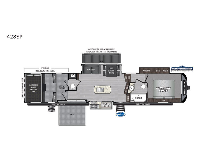 The Raptor toy hauler by Keystone has broken free from the rugged models of years past with its sharp, refined accessories and modern style, and to prove its advanced nature, the Raptor has included one of the largest refrigerators on the market into its design, an 18 cubic foot refrigerator. The Raptor is also a part of the only towable manufacturer who incorporates color-coded and numbered electrical wiring into its products, helping you save time and energy when troubleshooting electrical issues. Another best-in-the-industry component that is included with the Raptor is the 3-year limited structural warranty backed by Keystone RV which will ensure that these models truly are built for the long haul.