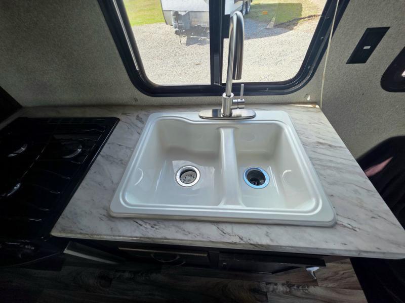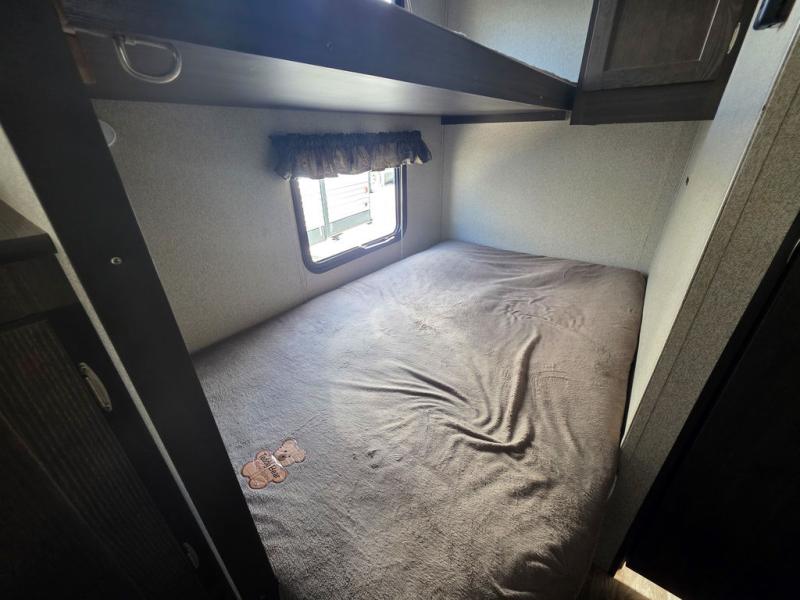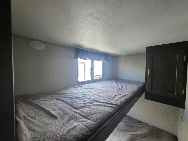 This Keystone Springdale 189FLWE is the perfect unit for a group of friends. There is a set of bunks in the rear, a sofa bed in the front, and a booth dinette that can fold down at night for some sleeping space if necessary. Outside you can set up a few camp chairs, patio furniture, outdoor games, the adjustable power awning and enjoy an amazing day outside. There is plenty of storage inside everywhere you look, up or down, and all around. The cook in the group will like having a place to cook all of the amazing camp meals.