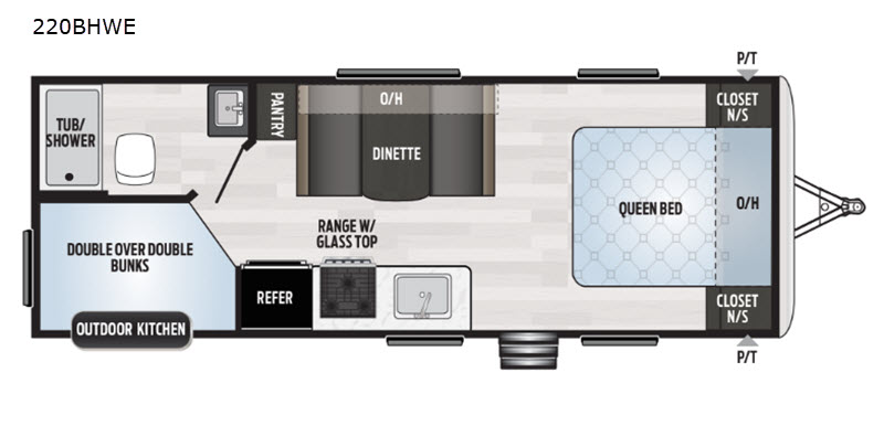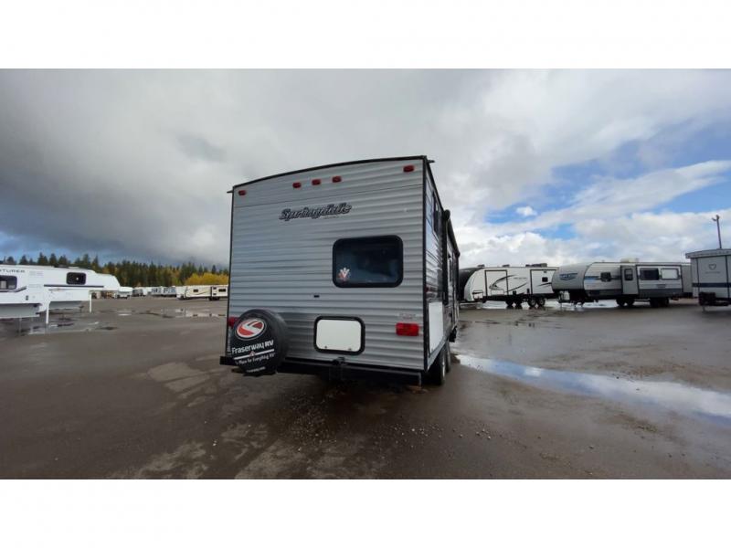 Enjoy traveling with a larger family in this Keystone Springdale travel trailer model 220BHWE. Your kids will love having their own space in the bunks in the rear. Having the convenience of the rear bathroom being right next to the kid's beds is super nice, especially at night. The cook in the family will LOVE having the option to be able to cook outside with the pull-out kitchen or inside with this Springdale kitchen. Don't worry about storage space while you are away either. You can bring some outdoor games, camp chairs, and whatever else you can think of, just store it in the pass through storage outside!