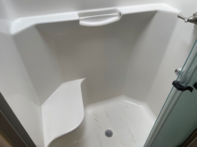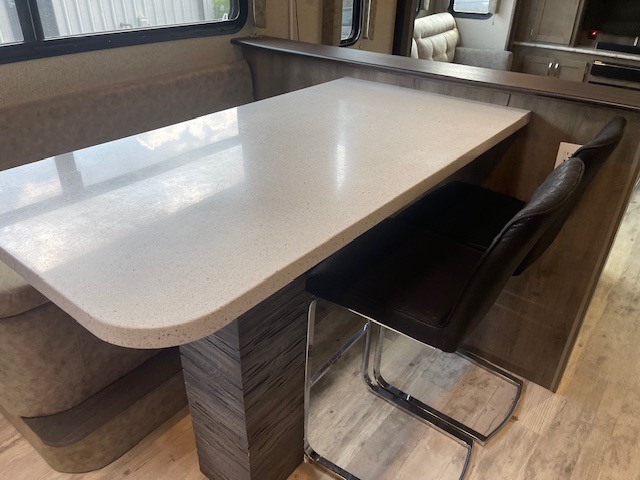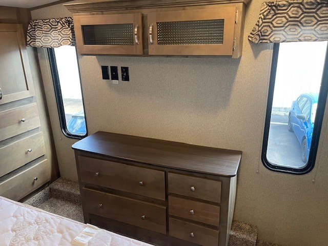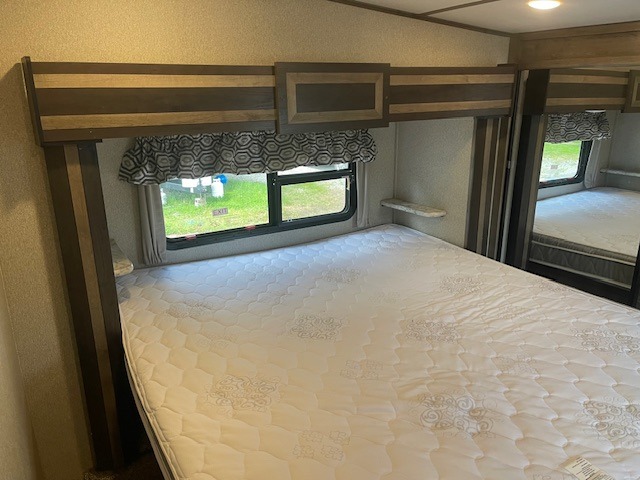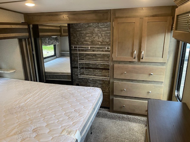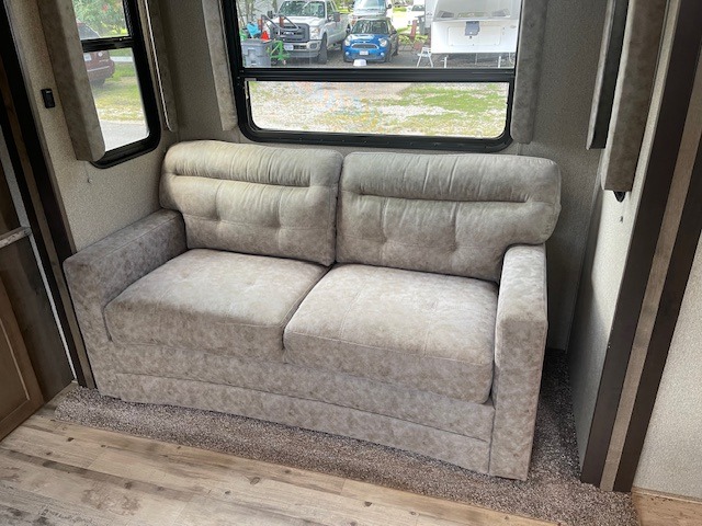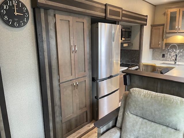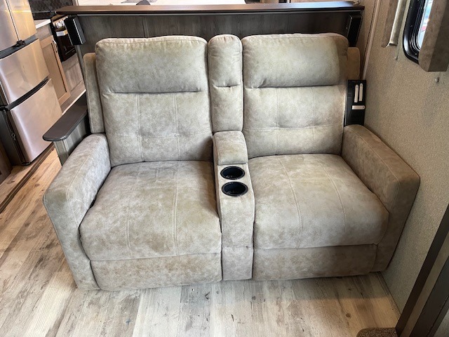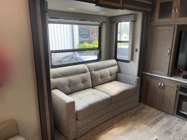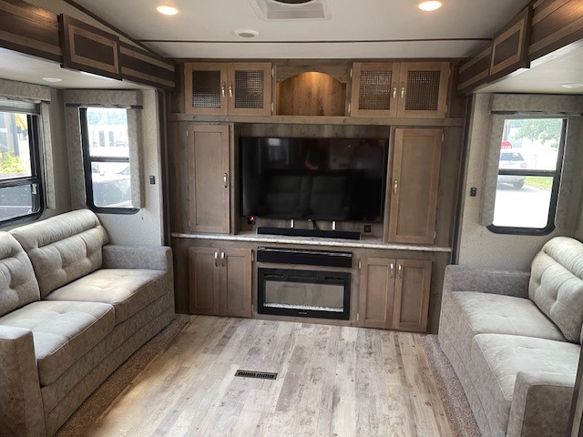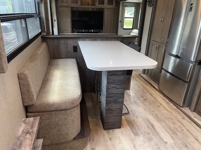 You can experience two living areas in this model, one separate space inside and one space outside under the awning. You will find yourself hanging out in the rear den with a full wall HDMI entertainment center including a 50" HDTV and a fireplace when you aren't outdoors. There is a spacious kitchen just behind the reclining theatre seating with full appliances to make any meal, including a double door residential refrigerator to store leftovers, and plenty more at-home conveniences such as the choice of bench or chair seating at the dinette. The master bedroom will treat you like a king, plus you might even choose to add a washer and dryer option if you plan to stay for awhile.