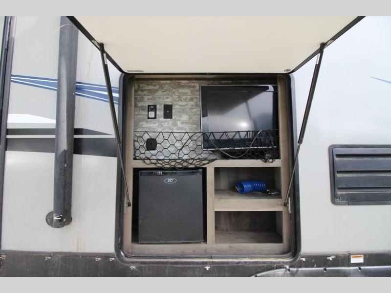 Your camping trip just got upgraded when you take this Sprinter Campfire Edition travel trailer to your favorite campground. From the rear bunk above the flip-over sofa bed below, the bike/utility door for more traveling storage inside, and the dual entry for easy access for everyone, plus the floor-to-ceiling pantry, this model just makes sense for your family. Just imagine relaxing outside under the awning with access to the outdoor convenience center, or watching the 40" TV and HDMI entertainment center inside the living area while relaxing on the queen-size tri-fold sofa. The range includes a glass top, the kitchen sink is extra large and includes a cover for more prep space, and you have dimmable lighting in the living room/dining slide out. This is the one!