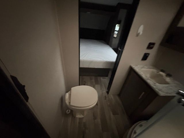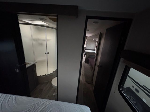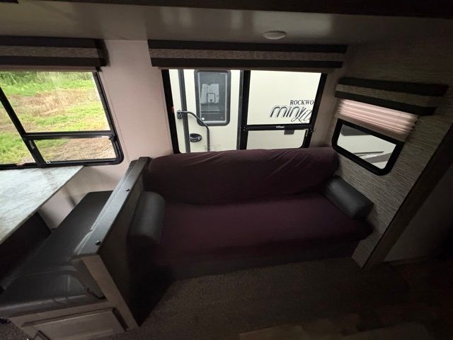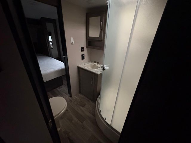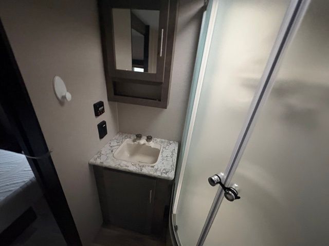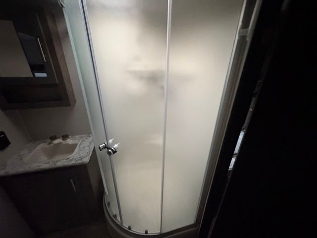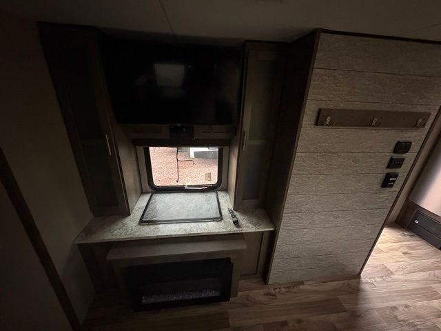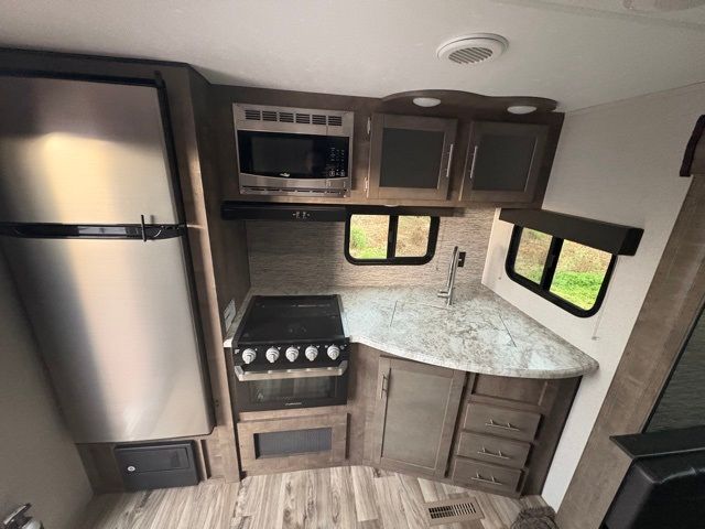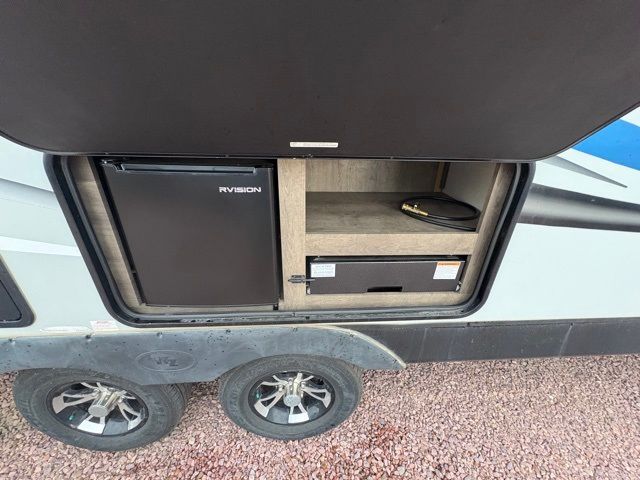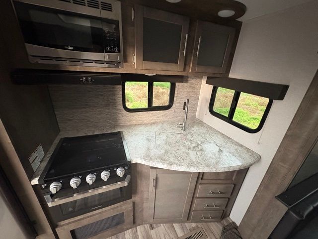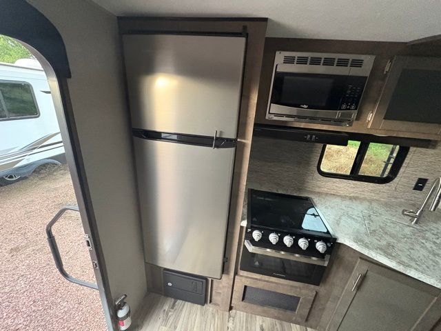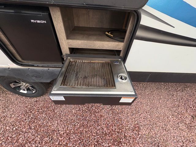 Just imagine staying at your favorite RV park with your own accommodations with a few extra features you didn't even know you would want or need. Before you enter on the flip-up solid steps you will find an outside kitchen with a capital grill as well as a trunk door for easy storage. The exterior also offers a flip-up 71" storage rack to place your bikes or totes on while traveling, you can even store a few outdoor items on the rack when you are parked at the campsite. Once inside you will appreciate the rear kitchen layout allowing you quick access inside to stay fueled for all the fun. The combined living and kitchen area allows you to make meals, watch the LED TV, and relax on the furniture. The convenient dual entry bath offers everything you will need to stay refreshed and ready for the next day. Don't forget about the bedroom's queen bed and overhead lighting. It's time to stop imagining and start living your dreams!