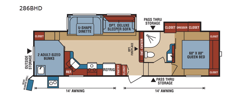 If you are looking for a unit that will provide enough sleeping space for ten people, then look no further than this Durango 1500 fifth wheel. With its queen-size bed, set of double bunk beds, and U-shaped dinette, everyone will have their own comfortable sleeping accommodations each night. Roasting marshmallows out by the campfire will be enjoyable underneath the two 14' electric awnings with LED lights, and whenever you get thirsty, you will find it convenient to grab an icy cold beverage from the outdoor kitchen.