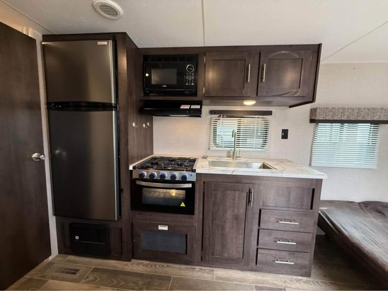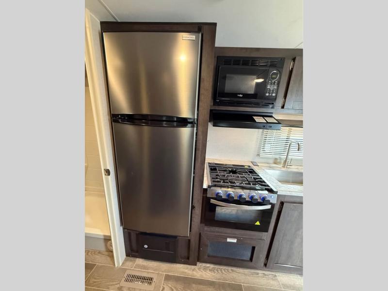 - Kitchen Amenities: 10 cu. ft. 12V gas/electric refrigerator, three-burner cooktop, microwave, and double sink for efficient meal prep.