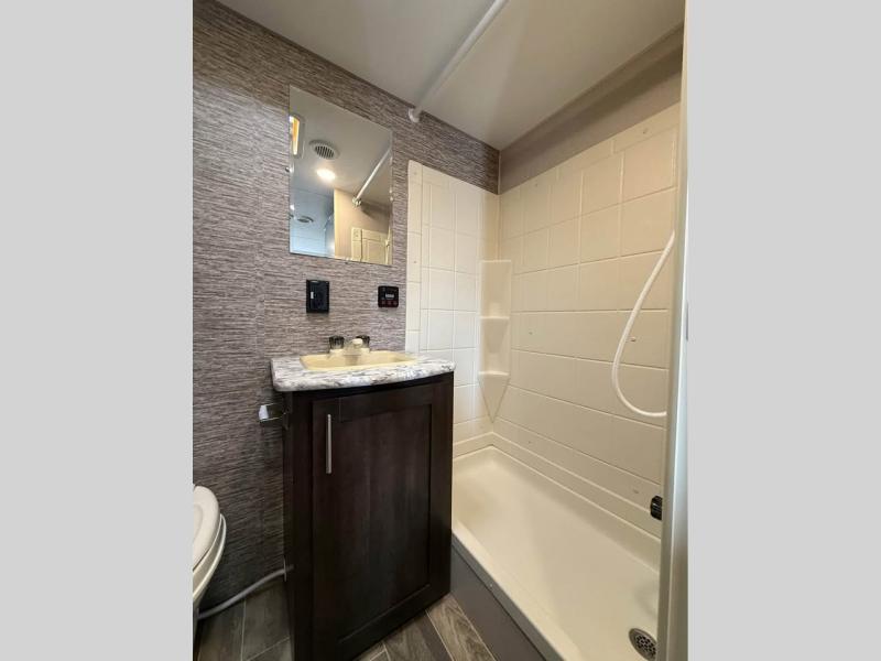 - Front Bathroom: Spacious layout with 24" x 36" radius shower, toilet, sink, and storage for convenience.