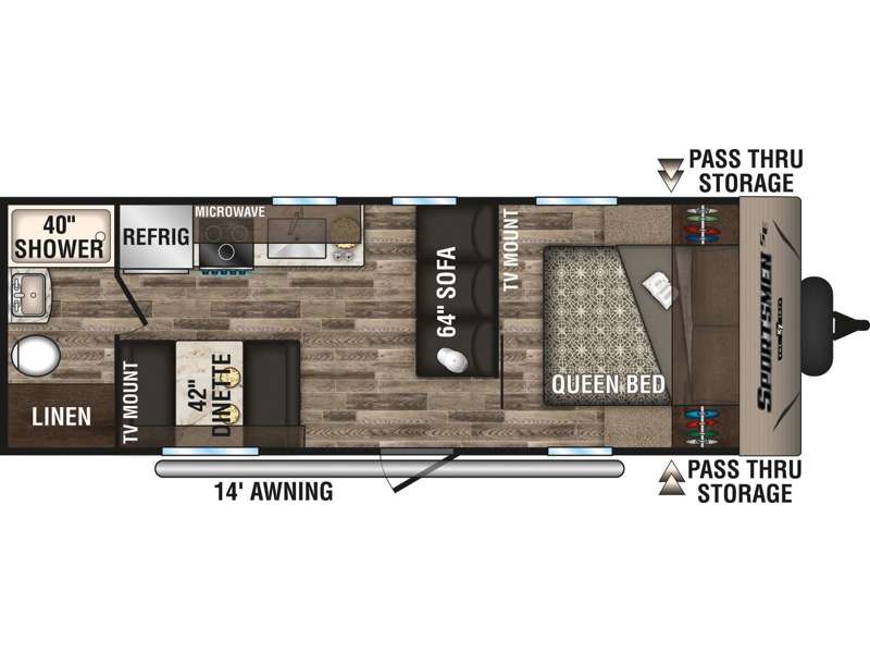 - Exterior Features: 14 ft power awning with LED light strip, pass-through storage, and scissor-style stabilizer jacks for easy setup.