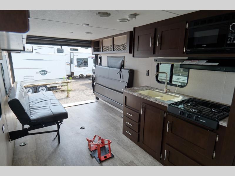 Load up your toys into this comfortable and functional travel trailer to hit the dunes or off-road park! Once you arrive to your destination, unload your toys through the ramp door to start having fun. When you get back, you can take a quick shower in the walk-through bathroom, make a meal in the kitchen, or take a nap on the queen bed in the private front bedroom. The kids can play games at the dual opposing roll-over sofas with a free standing table which can easily be moved wherever you need. The fun starts now!