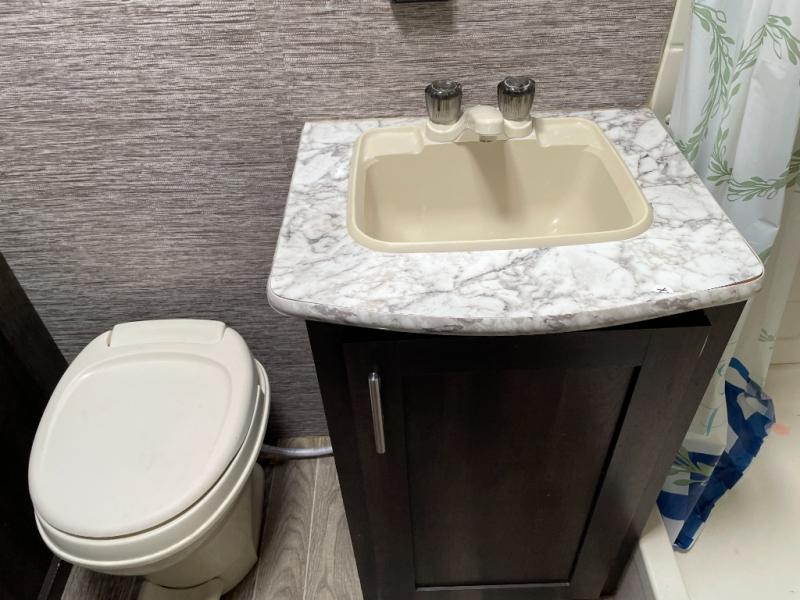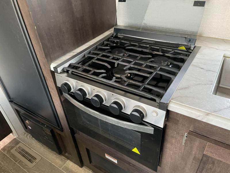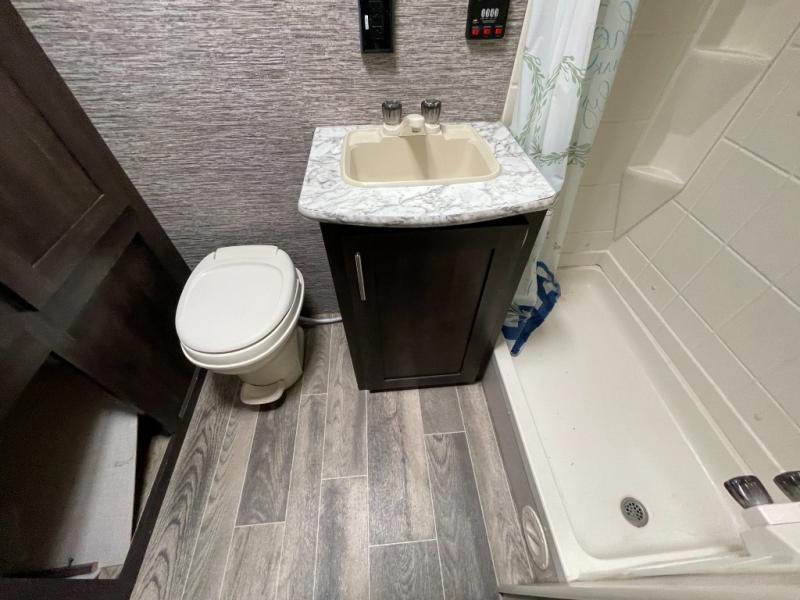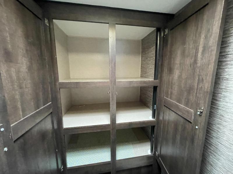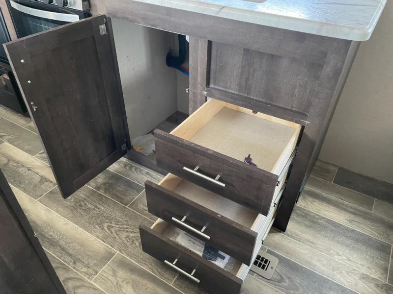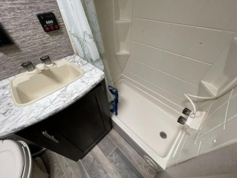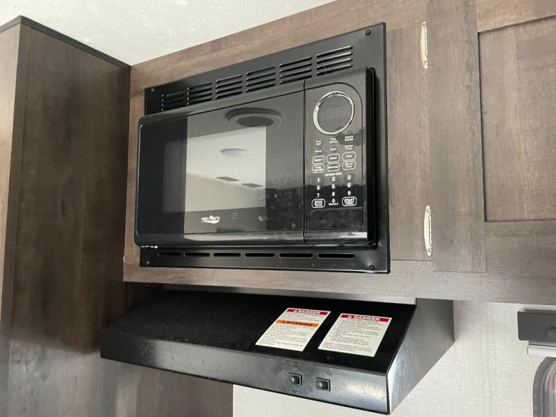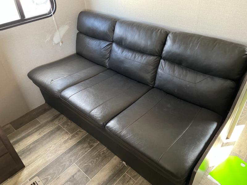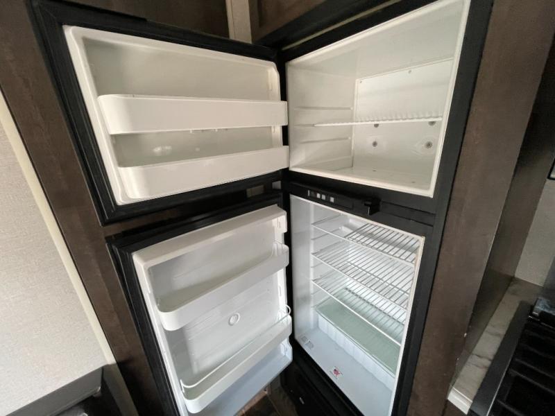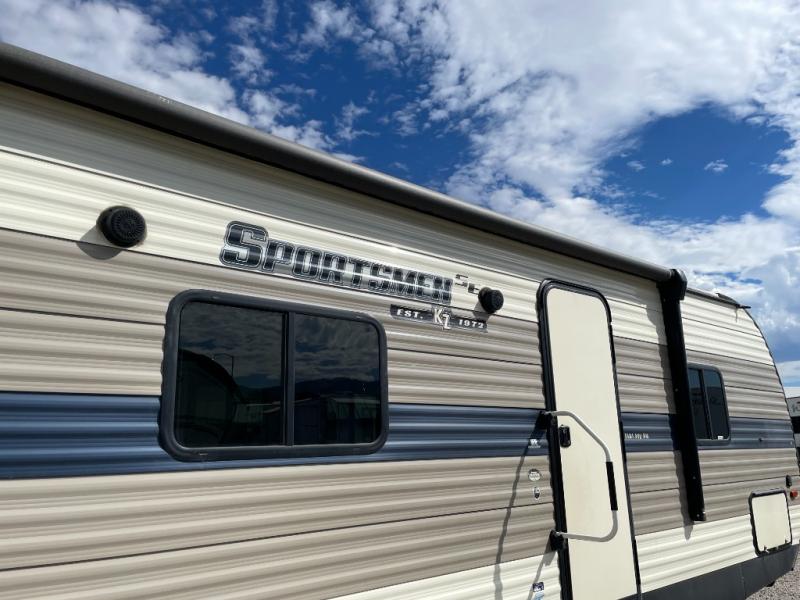 Whether you're vacationing off the coast or spending a weekend nestled up in the woods, this Sportsmen SE travel trailer will be your faithful sidekick with its accommodating amenities. The queen-size bed in the front private bedroom will be a comfortable place to relax each evening after you've grabbed your late-night snack from the 10 cubic foot refrigerator. Your kids or extra guests can sleep on the 42" booth dinette or 64" sofa, and you can offer them additional blankets that you have stored in the large linen closet in the rear bathroom.