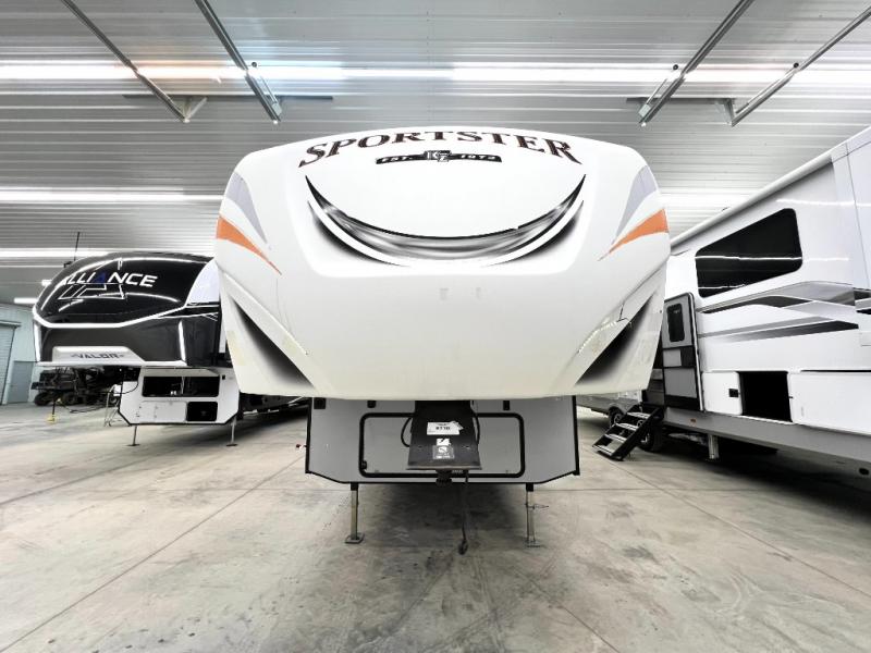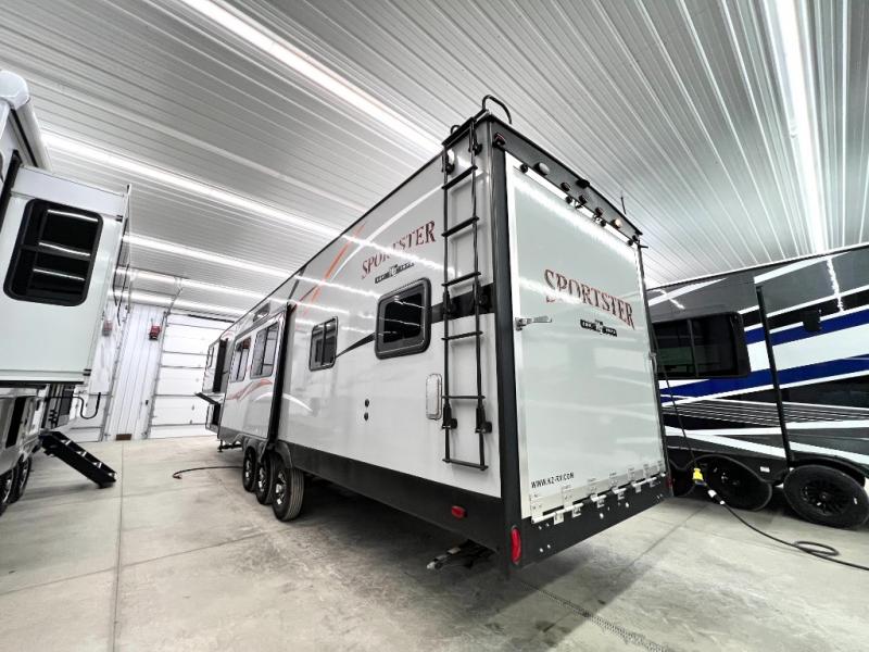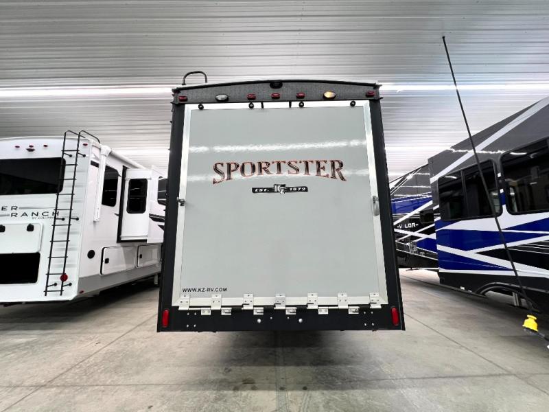 You won't find wasted space inside any of these Sportster fifth wheel toy haulers by KZ with features like the rollover sofas, the 8' wide body, and the large overhead cabinets! Each unit also offers at home features you are sure to love traveling with like the 8 cu. gas/electric refrigerator, the microwave with a turntable, LED lighting, and a pillowtop queen mattress for a good night's rest. Along the exterior there are even more convenient features including the outside shower, a power awning with LED lights to keep the good times going even when it gets dark, and a pass-through storage area for your outdoor camping gear. With the Equa-Flex suspension, the power front jack, and the nitrogen filled tires with aluminum wheels plus a climate package you will experience a fifth wheel toy hauler that is built to last your greatest adventures! So, come choose your KZ Sportster model today!