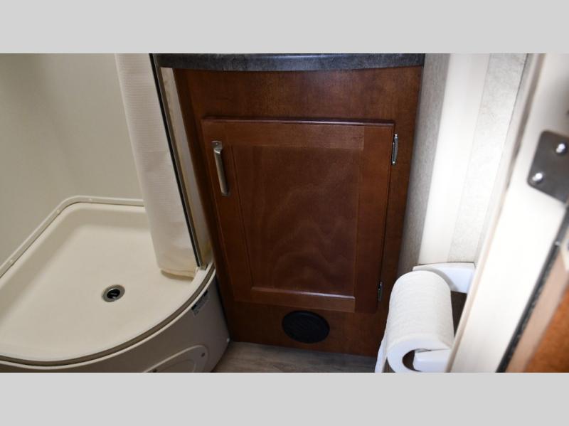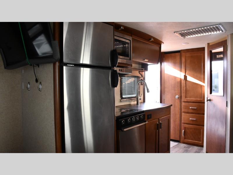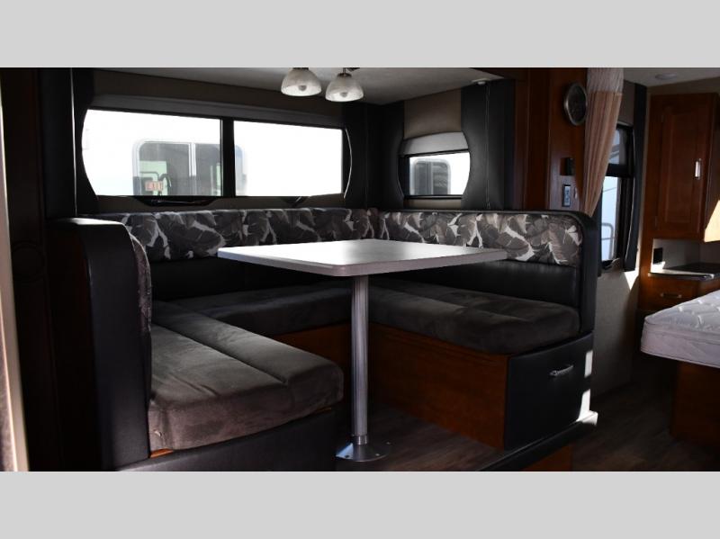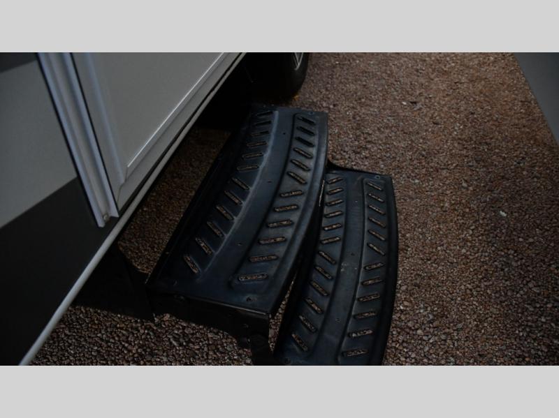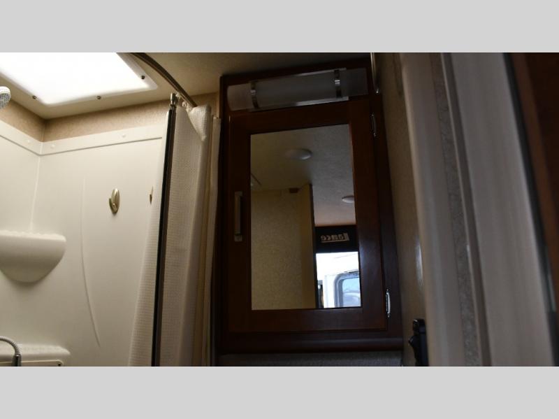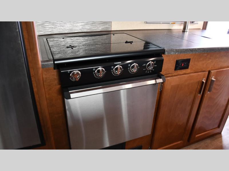 Step inside to find a thoughtfully laid-out interior that feels bright, airy, and functional. The walk-around queen bed provides comfort and flexibility, while the U-shaped dinette is perfect for family meals, board games, or even extra sleeping space for guests. The three-burner range allows you to prepare your favorite meals on the road, and the included bathroom mirror adds convenience to your morning routine.