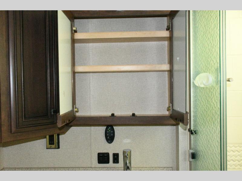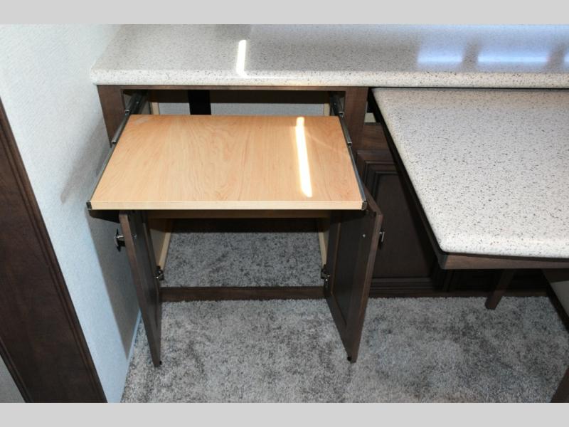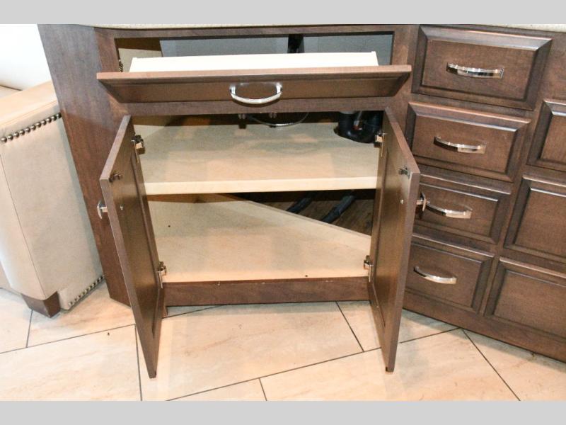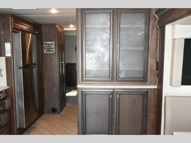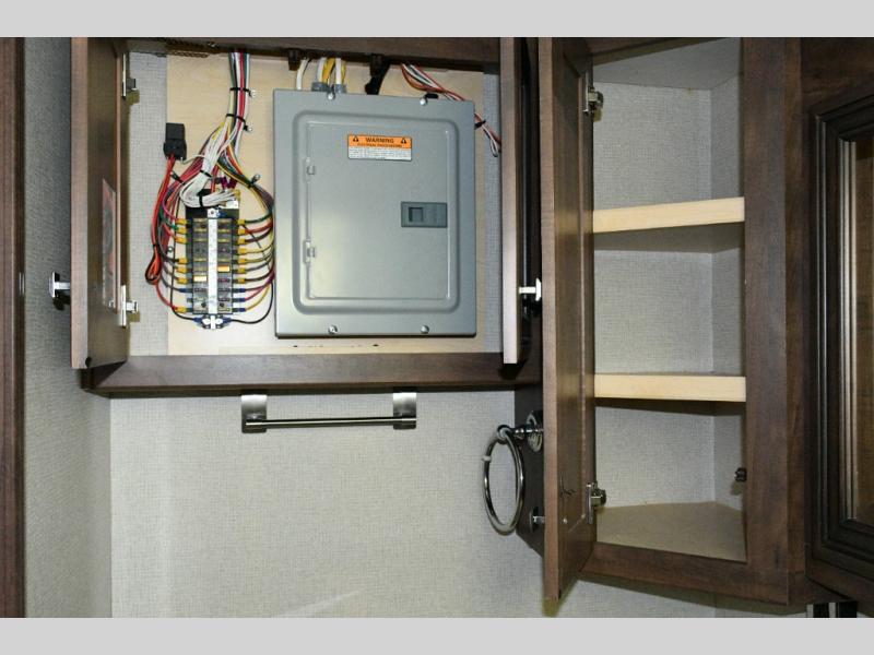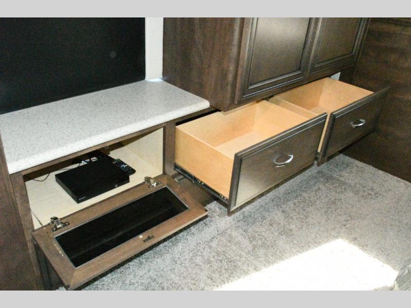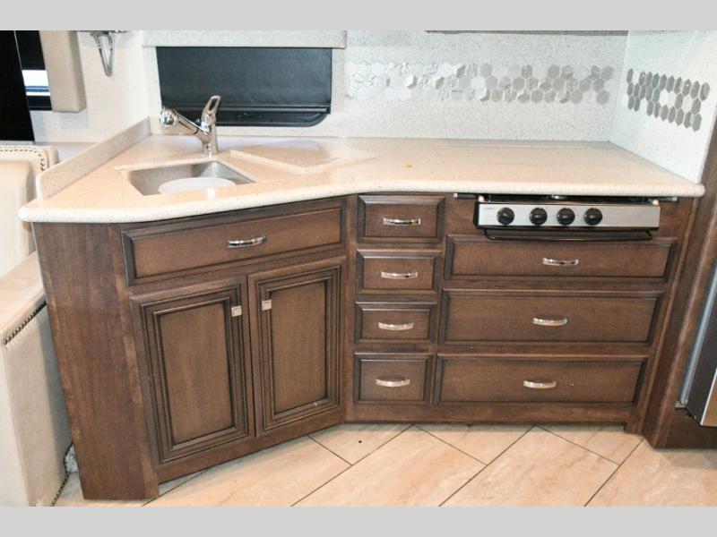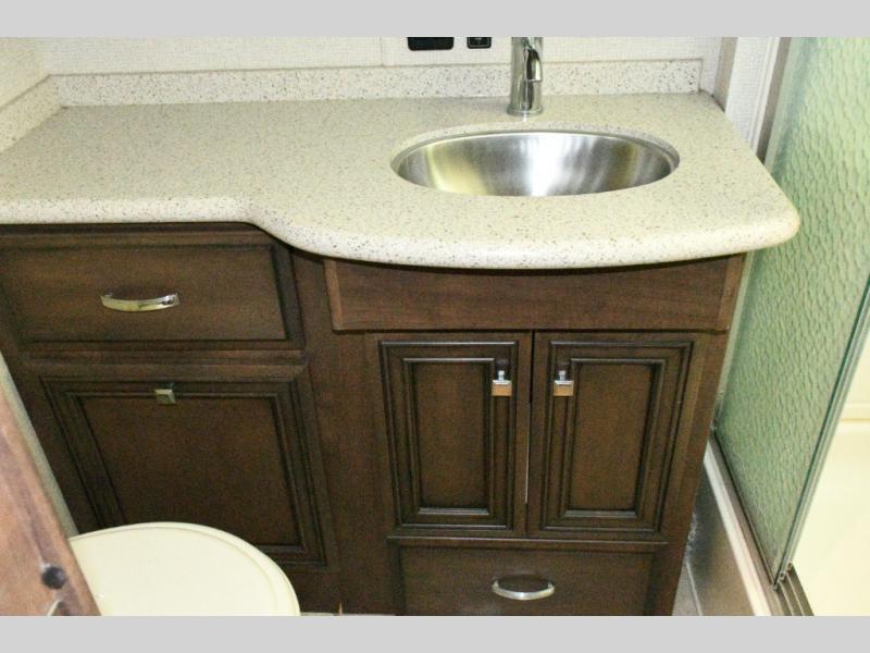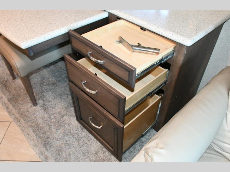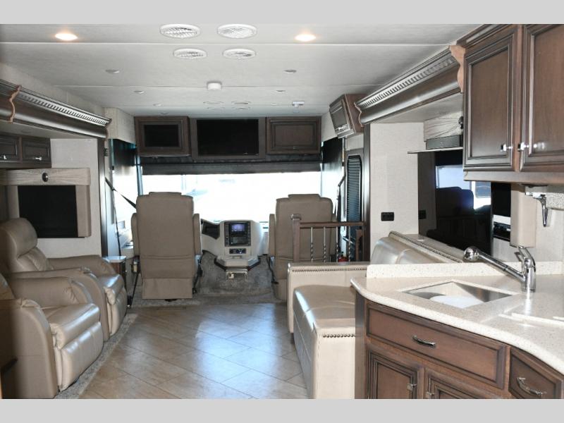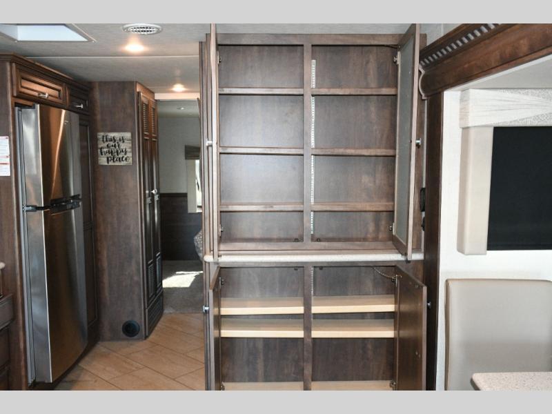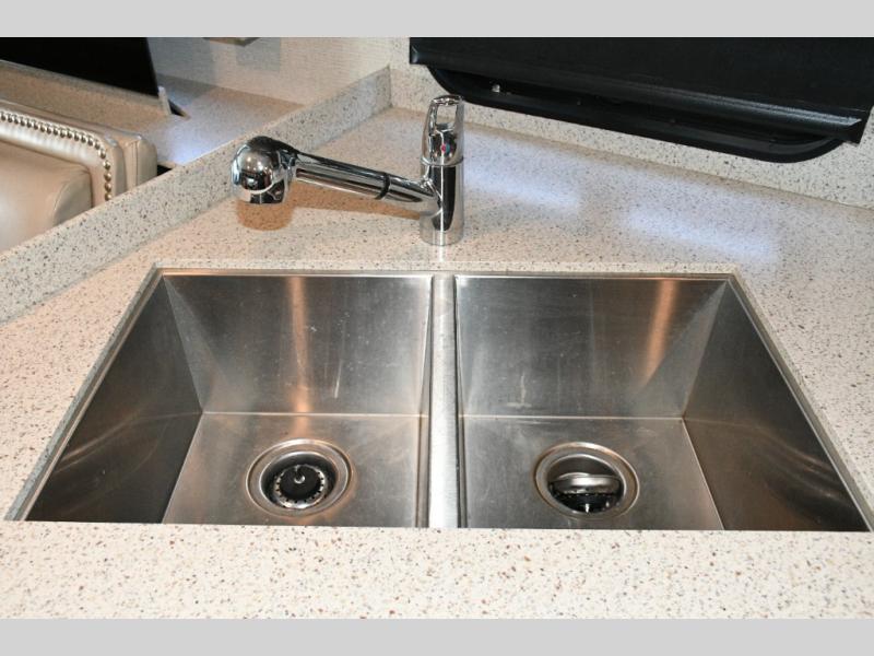 The exterior Masterpiece full-painted graphics with clearcoat finish make a bold statement at every campground, while the DuraShield front cap protection helps preserve that like-new appearance. Inside, Flexsteel deluxe leather seating and high-end finishes elevate every mile, whether you’re cruising cross-country or settling in for a seasonal stay.
