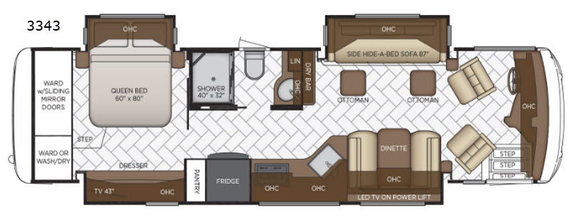 Are you ready to camp in style and comfort? With all of the modern conveniences inside this New Aire 3343 you will surely enjoy your time away from home. The full wall slide out along the door side opens up this model and gives you the maximum amount of floor space. When you are ready to visit with your family then you will find seating at the driver and passenger seats which swivel around, the 87" Jack Knife sofa, plus the dinette. This kitchen area features plenty of room to work plus there is a stainless steel three door residential refrigerator for your perishables. In the rear bedroom you will get a good night's sleep on the queen bed plus there is plenty of storage with the large wardrobe and the dresser.