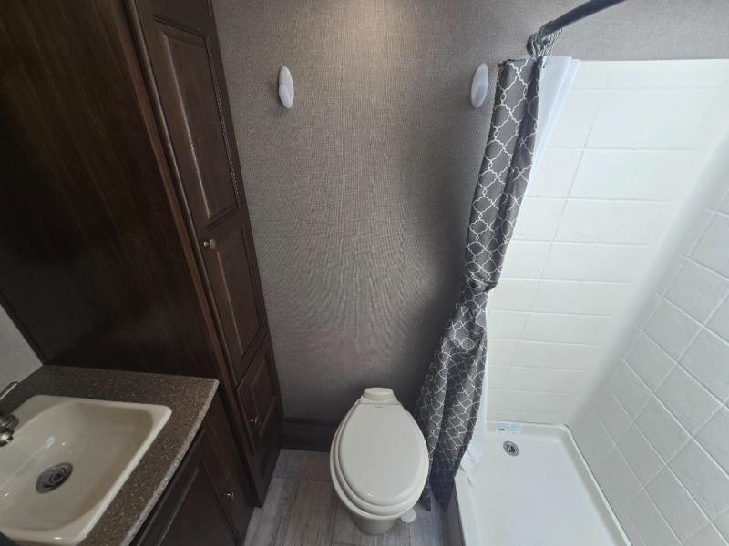 If you enjoy traveling comfortably, then you will enjoy traveling in this PaloMini. With a two-burner cooktop, and microwave below the countertop, and a secluded rear full bathroom, you don't have to sacrifice that at-home feeling while you're on the road. The storage above the refrigerator is perfect to place snacks and paper goods, and you'll find overhead storage throughout. And you can walk on either side of the bed, and claim a wardrobe all to yourself.