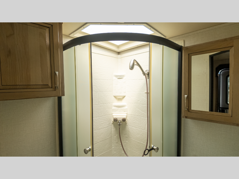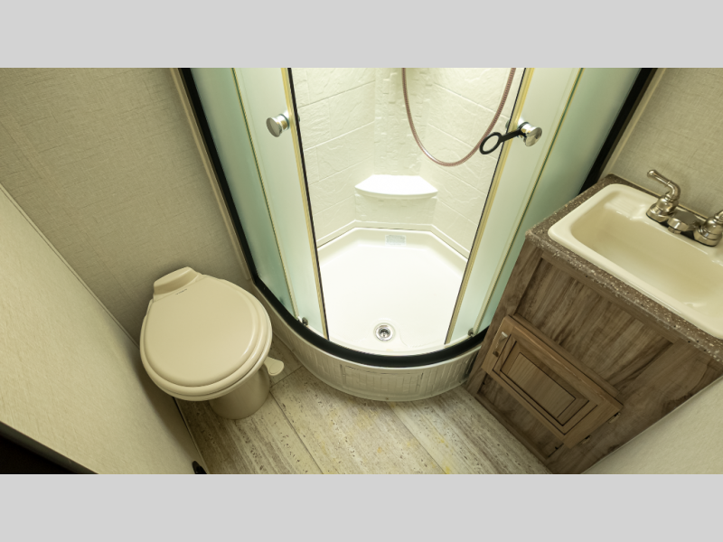 - Full rear bath with 32” radius shower & porcelain toilet